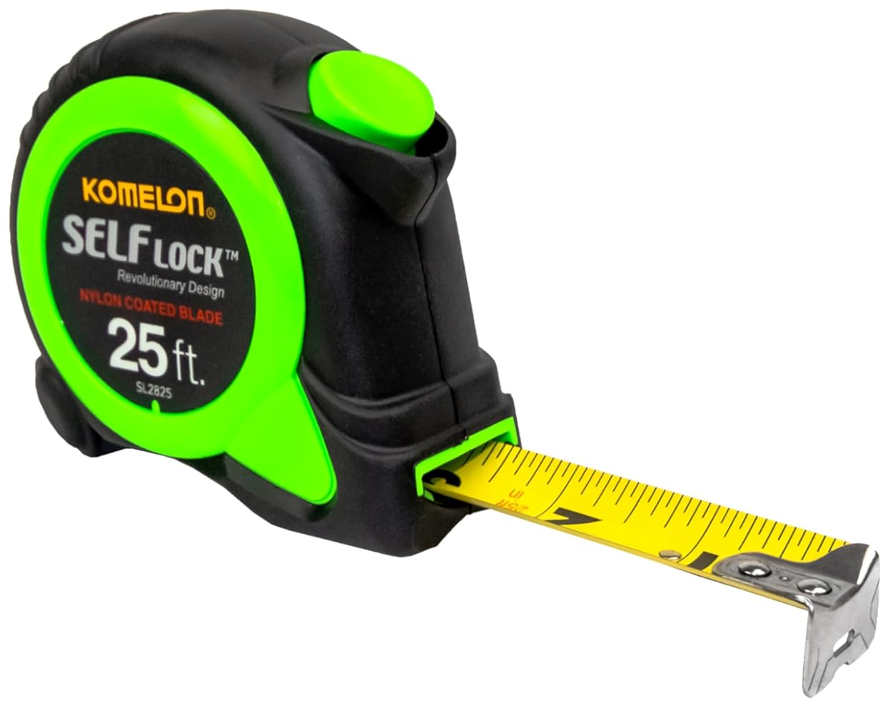 {"about_product": ["AUTOMATIC LOCK - Self locking mechanism allows blade to lock automatically and retract at the push of a button.", "NYLON COATED BLADE - Provides maximum blade protection.", "IMPACT RESISTENT CASE - ABS plastic with rubber over mold protects the case from accidental drops.", "STUD MARKINGS - Printed every 16 inches.", "HIGH CARBON STEEL - Provides the most durable blade and retraction spring.", "Automatic blade lock"], "product_description": "Product Description 416-SL2825 Features: -Self locking mechanism allows blade to be extended smoothly. -Push button allows blade to be retracted smoothly. -Nylon coated blade for maximum durability. -Impact resistant rubberized case. Product Type: -Tapes. Dimensions: Overall Product Weight: -0.83 Pounds. From the Manufacturer The Self Lock Series of tape measures is a unique line of tape measures. The series features 12-foot x 5/8-inch, 16-foot x 3/4-inch, 16-foot x 1-inch, 25-foot x 1-inch, 25-foot x 1-inch inch/Engineer scale. The Self Lock Series features a unique self locking mechanism that allows the blade to extend smoothly as well as a push button release that insures complete control when retracting the blade. This is the ideal measuring tool for anyone from the do it yourselfer to a professional tradesmen. The series also provides an impact resistant rubberized case and a nylon coated blade for maximum durability.", "product_information": {"ASIN": "B000BQKXLE", "Department": "Unisex-Adult", "Manufacturer": "Komelon", "Customer Reviews": "4.7 4.7 out of 5 stars \n\n (18,301)", "Best Sellers Rank": "#3,267 in Tools & Home Improvement (See Top 100 in Tools & Home Improvement) #19 in Tape Measures", "Item model number": "SL2825", "Product Dimensions": "2.4 x 4.8 x 6.8 inches; 13.28 ounces", "Date First Available": "October 21, 2017", "Is Discontinued By Manufacturer": "No"}, "product_details": {"Brand": "Komelon", "Color": "Green", "Item Weight": "13.28 ounces", "Product Dimensions": "3.5"L x 2"W", "Measurement Accuracy": "+/- 0.03"}}