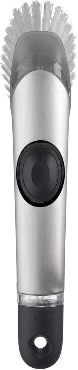 {"about_product": ["No-leak, no-mess soap dispensing", "Durable nylon bristles easily scrub away baked-on food and are safe for non-stick cookware", "Can be replaced with brush, sponge or scrub heads", "Soft, comfortable grip is non-slip, even when wet"], "product_description": "Product Description The OXO Steel Soap Squirting Dish Brush combines a long held brush with liquid dish soap for convenient cleaning. The soft button doubles as a seal; simply pull open the seal fill the clear body with soap. Reseal the opening, you're ready to dispense soap with the press of a button! The soft grip is comfortable to hold is non-slip, even when wet. Durable nylon bristles easily scrub away baked-on food are safe for non-stick cookware. When it's time for a new brush head, simply push up on the tab to replace it. Attach the new brush head by simply sliding it on. Durable nylon bristles easily scrub away baked-on food are safe for non-stick cookware. Refill brush heads come in a pack of two for convenience include instructions. Replacement sponge, scrub or brush heads sold separately. Dimensions: 4″ x 1. 75″ x 10. 5″ . Brand Story By OXO", "product_information": {"UPC": "719812015484", "ASIN": "B000ND7A5M", "Brand": "OXO", "Color": "Stainless", "Shape": "Round", "Import": "Imported", "Material": "Stainless Steel", "Department": "Unisex", "Unit Count": "1.0 Count", "Item Weight": "3.17 ounces", "Manufacturer": "OXO International Ltd.", "Handle Material": "Alloy Steel", "Number of Items": "1", "Special Feature": "Durable", "Number of pieces": "1", "Assembly required": "No", "Best Sellers Rank": "#15,347 in Health & Household (See Top 100 in Health & Household) #519 in Household Cleaning Tools", "Item model number": "1068584", "Batteries required": "No", "Product Dimensions": "10.5\"L x 4\"W x 1.75\"H", "Included Components": "Holder", "Warranty Description": "Satisfaction guaranteed! If for any reason you are not satisfied with an oxo product, return it for replacement or refund.", "Surface Recommendation": "Glass, Plastic, Ceramic", "Item Firmness Description": "Medium", "Specific Uses For Product": "Dish, Kitchen", "Is Discontinued By Manufacturer": "No", "Global Trade Identification Number": "00719812015484"}, "product_details": {"Brand": "OXO", "Color": "Stainless", "Handle Material": "Alloy Steel", "Product Dimensions": "10.5"L x 4"W x 1.75"H", "Specific Uses For Product": "Dish, Kitchen"}}