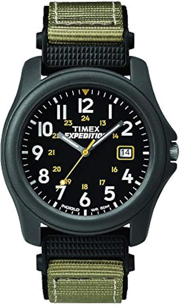 {"about_product": ["Adjustable gray-green 20mm nylon strap fits up to 8-inch wrist circumference.Buckle/Clasp: Hook and Loop", "Black dial with date window at 3 o'clock; full Arabic numerals", "Gray 39mm resin case with acrylic lens", "Indiglo light-up watch dial; luminous hands", "Water resistant to 50m (165 ft): In general, suitable for short periods of recreational swimming, but not diving or snorkeling"], "product_description": "This clean, simple, military-inspired Timex Expedition Camper watch hasn't changed much since 1918. We made it a little lighter, added a nylon Fast Wrap strap with Velcro fastener, and our signature Indiglo night-light.", "product_information": {"ASIN": "B000SZNSVA", "Language": "English", "Batteries": "1 Lithium Metal batteries required. (included)", "Department": "mens", "Manufacturer": "Timex", "Customer Reviews": "4.4 4.4 out of 5 stars \n\n (10,174)", "Best Sellers Rank": "#58,974 in Clothing, Shoes & Jewelry (See Top 100 in Clothing, Shoes & Jewelry) #227 in Men's Wrist Watches", "Item model number": "T425714E", "Product Dimensions": "5.12 x 5.12 x 5.12 inches; 1.12 ounces", "Date First Available": "September 2, 2003", "Is Discontinued By Manufacturer": "No"}, "product_details": {"Material": "Resin"}}