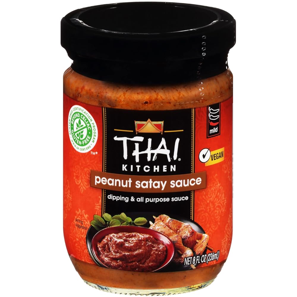 {"about_product": ["Flavors of peanuts, coconut milk and spices", "Versatile sauce works as a salad or Thai noodle dressing, dipping sauce and more", "Gluten free and vegan", "Recipe tip: For Thai Beef and Peanut Stir Fry with a touch of luxury, add ¼ cup of Peanut Satay Sauce to 8 oz beef, thinly sliced.", "DID YOU KNOW? The classic flavor of our Peanut Satay Sauce brings the memorable flavor of southern Thailand right to your dinner table"], "product_description": "Thai Kitchen Gluten Free Peanut Satay Sauce is crafted with peanuts slowly simmered in coconut milk and spices for a sweet, earthy taste. Serve it as a cooking sauce or toss it with noodles for an amazing stir-fry! This incredibly versatile gluten-free sauce makes the perfect salad or noodle bowl dressing, accompaniment to grilled meats or dipping sauce for veggies or seafood. Our Peanut Satay Sauce brings the memorable flavors of southern Thailand right to your dinner table or backyard. This Thai Kitchen Gluten Free Peanut Satay Sauce is in a Glass jar that is 8 fluid ounces. Store this shelf-stable item at an ambient temperature.", "product_information": {"UPC": "737628005000", "ASIN": "B000WGEMXS", "Units": "8 Fluid Ounces", "Manufacturer": "McCormick & Company, Inc.", "Customer Reviews": "4.2 4.2 out of 5 stars \n\n (2,756)", "Best Sellers Rank": "#21,081 in Grocery & Gourmet Food (See Top 100 in Grocery & Gourmet Food) #11 in Curry Sauce", "Item model number": "dinirao", "Product Dimensions": "2.63 x 2.63 x 4 inches; 0.2 ounces", "Is Discontinued By Manufacturer": "No"}, "product_details": {"Brand": "Thai Kitchen", "Flavor": "Peanut satay", "Item Weight": "5.6 Grams", "Package Information": "Jar", "Allergen Information": "Peanuts, Sesame Seeds, Tree Nuts"}}