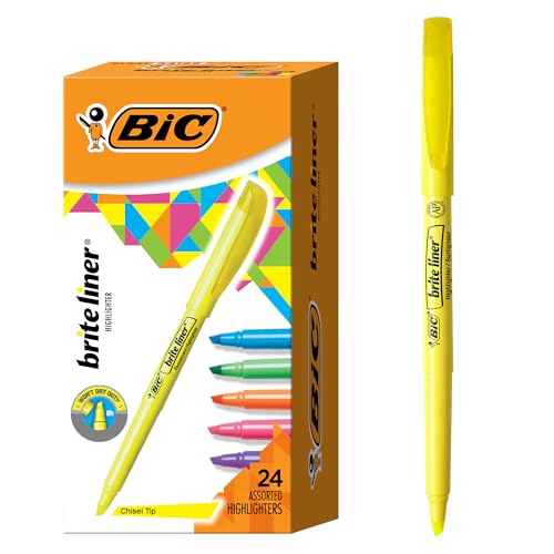{"about_product": ["One 12-count pack of BIC Brite Liner Yellow Highlighters", "Dependable yellow highlighters bulk pack with a chisel tip for broad highlighting or fine underlining", "Highlighter set with translucent ink that emphasizes what's important on the page without obscuring the highlighted text", "Long-lasting thin yellow highlighters write up to eight hours without drying out even with the cap left off", "ACMI-approved highlighters are a perfect addition to your art, school or office supplies"], "product_description": "Make organization fun and easy with the BIC Brite Liner Yellow Highlighter Set. These highlighters have a chisel tip for broad highlighting or fine underlining, making them perfect for highlighting school or office documents. BIC's highlighter markers use translucent ink to emphasize what's important on the page without obscuring the text below. Reliable and long-lasting, each BIC Brite Liner highlighter writes for up to eight hours without a cap and does not dry out, so you can work with confidence. The convenient pen-shaped design lets you easily grip and comfortably use the highlighters chisel tip to organize your notes or underline passages in textbooks, notebooks and documents. Looking for classic highlighters for journals or yellow marker sets for adults? BIC Brite Liner Yellow Highlighters add a fun pop of color to your art, office or school supplies. Each pack contains 12 yellow chisel tip highlighter markers. BIC highlighters are ACMI-approved for a high-quality, safe product you can trust. Whether you're emphasizing text or just feel like getting creative, choose BIC Brite Liner Highlighters.", "product_information": {"ASIN": "B0017D2L42", "Item Weight": "2.24 ounces", "Manufacturer": "BIC Corporation", "Number of pieces": "12", "Assembly required": "No", "Best Sellers Rank": "#197 in Office Products (See Top 100 in Office Products) #6 in Liquid Highlighters", "Item model number": "BICBL11YW", "Batteries required": "No", "Product Dimensions": "1.4 x 2.8 x 5.6 inches", "Warranty Description": "Contact Manufacturer", "Is Discontinued By Manufacturer": "No"}, "product_details": {"Brand": "BIC", "Ink Color": "Fluorescent Yellow", "Point Type": "Chisel", "Number of Items": "1", "Recommended Uses For Product": "Marking Out"}}