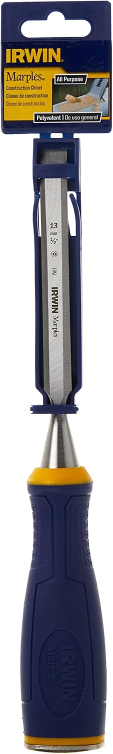 {"about_product": ["This all-purpose, bevel-edge chisel has a large strike cap and split-proof handle withstands repetitive hammer strikes.", "Ergonomic handle design with ProTouch Grip is durable enough to withstand jobsite abuse.", "High-carbon steel blade delivers superior performance and edge retention, and stays sharp to the last inch.", "IRWIN Tools Marples chisels have been the industry leader for woodworkers for nearly 200 years."], "product_description": "Product Description This all-purpose, bevel-edge chisel has a large strike cap and split-proof handle withstands repetitive hammer strikes. Ergonomic handle design with ProTouch Grip is durable enough to withstand jobsite abuse. High-carbon steel blade delivers superior performance and edge retention, and stays sharp to the last inch. IRWIN Tools Marples chisels have been the industry leader for woodworkers for nearly 200 years. IRWIN Tools Marples Construction Chisel, 1/2-inch (1768774) From the Manufacturer The Irwin Tools 1768774 Marples M500 Metal Strike Cap All Purpose Chisel 1/2\" features Quality Blades that are strong in design and stay sharp to the last inch. The Splitproof handle is strong enough to be hit with a hammer. Used by the professionals and the DIY enthusiast alike. This Chisel is ideal for Carpenters, Woodworkers, Joiners, Builders, Plumbers, Electricians, Roofers, Floorers, and Home Owners (DIY).", "product_information": {"UPC": "038548991078", "ASIN": "B003M68TVG", "Size": "1/2\"", "Brand": "IRWIN", "Color": "Blue", "Shape": "Rectangular", "Usage": "specific_uses_for_product", "Finish": "Brushed", "Pattern": "Solid", "Material": "Blend", "Blade Edge": "Bevel", "Item Weight": "6.4 ounces", "Part Number": "1768774", "Manufacturer": "Irwin Tools", "Power Source": "ac", "Blade Material": "High Carbon Steel", "Handle Material": "Resin", "Number Of Pieces": "1", "Special Features": "Split-proof", "Best Sellers Rank": "#158,728 in Tools & Home Improvement (See Top 100 in Tools & Home Improvement) #102 in Wood Chisels", "Item model number": "1768774", "Product Dimensions": "1.15\"L x 2\"W", "Batteries Included?": "No", "Batteries Required?": "No", "Included Components": "CHISEL CONST 1/2\"", "Date First Available": "October 21, 2017", "Warranty Description": "No", "Item Package Quantity": "1", "Handle/Lever Placement": "End (opposite blade)", "Is Discontinued By Manufacturer": "No", "Global Trade Identification Number": "00038548991078"}, "product_details": {"Size": "1/2"", "Brand": "IRWIN", "Blade Edge": "Bevel", "Blade Material": "High Carbon Steel", "Handle Material": "Resin"}}