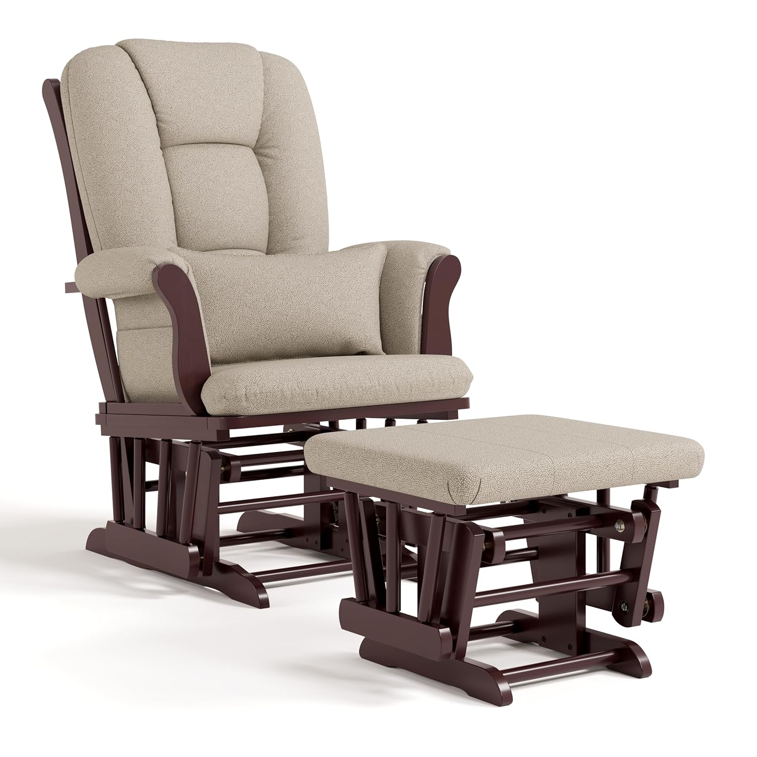 {"about_product": ["Wood", "Imported", "GREENGUARD GOLD CERTIFIED — FOR CLEANER INDOOR AIR: The Storkcraft Tuscany is GREENGUARD Gold Certified, meaning it has been screened for over 10,000 chemicals and VOCs known to pollute indoor air, contributing to cleaner, healthier air", "SOLID WOOD CRAFTSMANSHIP, LONG-LASTING DURABILITY: Our smooth-gliding, award-winning, GREENGUARD Gold Certified, all-in-one nursery glider & ottoman set is quality-crafted from solid wood, making it the perfect addition to your nursery or home", "BONUS LUMBAR CUSHION, SIDE POCKETS FOR CONVENIENT STORAGE: Bonus lumbar cushion included for comfort; Each padded arm cushion includes a convenient side storage pocket to conveniently store any reading materials or nursery essentials", "PRODUCT DIMENSIONS: Maximum recommended weight (250 pounds); Depth (32.38 in); Height (40.15 in); Width (28.35 in); Seat width (18.7 in); Seat depth (19.29 in); Seat height (17.32 in); Ottoman depth (15.35 in); Ottoman height (14.37 in); Ottoman width (19.69 in)", "PREMIUM NURSERY GLIDER & OTTOMAN SET: A top-rated nursery glider & ottoman set, the Tuscany is quality-crafted by Storkcraft – makers of quality nursery and kids bedroom furniture, since 1945; Easy assembly required; 1-year limited warranty"], "product_description": "Introducing the GREENGUARD Gold Certified, premium Storkcraft Tuscany Glider & Ottoman — Storkcraft's signature solid wood, quality-crafted, smooth-gliding 2-piece nursery glider & ottoman set, which also includes a bonus lumbar cushion for added comfort. The Tuscany Glider & Ottoman is quality-crafted of solid wood, and is GREENGUARD Gold Certified — meaning it has been screened for over 10,000 chemicals and VOCs known to pollute indoor air, contributing to cleaner, healthier air. Each of the Tuscany glider's padded arm cushion includes a convenient side storage pocket to conveniently store any reading materials, electronics, or nursery essentials. The Tuscany's applied finish tested to meet or exceed applicable ASTM and CPSIA safety standards. The Storkcraft Tuscany Glider & Ottoman is backed by Storkcraft’s 1-year limited warranty and supportive, real-life Customer Care team. Storkcraft, established in 1945, has been internationally recognized with some of the top design and innovation awards, including being named an Honorable Mention in the 2024 Fast Company Innovation by Design Awards. Easy, 30-minute assembly (two people recommended for assembly). Crafted with love, by Storkcraft — makers of quality nursery and children's furniture since 1945.", "product_information": {"UPC": "056927091935", "ASIN": "B00L40SGOM", "Finish": "Wood", "Material": "Wood", "Item Weight": "46 pounds", "Manufacturer": "Stork Craft", "Material Type": "Wood", "Target gender": "Unisex", "Safety warning": "check instructions manual", "Number Of Items": "1", "Special Feature": "Arm Rest, Foot Rest, Side Pocket", "Best Sellers Rank": "#8,329 in Baby (See Top 100 in Baby) #1 in Nursery Rocking Chairs #2 in Nursery Glider & Ottoman Sets #9 in Glider Chairs", "Item model number": "06554-569", "Number of Drawers": "1", "Batteries required": "No", "Product Dimensions": "29.33 x 22.46 x 20.38 inches", "Product Care Instructions": "Wipe Clean", "Additional product features": "Arm Rest, Foot Rest, Side Pocket", "Maximum weight recommendation": "250 Pounds", "Global Trade Identification Number": "00056927091935"}, "product_details": {"Size": "1 Count (Pack of 1)", "Brand": "Storkcraft", "Color": "Espresso W/Taupe Swirl", "Style": "Transitional", "Item Weight": "45.98 Pounds"}}