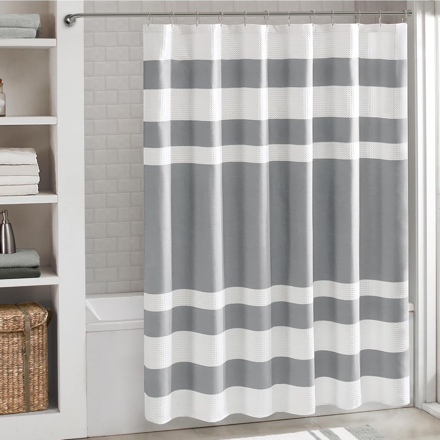 {"about_product": ["100% Polyester", "Product Features - Madison Park Spa Waffle Shower Curtain with 3M Treatment. The rich blush pieced with a white waffle weave manipulation makes you feel like you're in the spa while the 3M water repellent treatment keeps your curtain looking newer, longer", "Material and features –190gsm polyester, 3 meter water repellent scotchagrd treatment, while the 3 meter water repellent treatment keeps your curtain looking newer, longer. Measures 72 (w) x 72 (l) inches long and wide. Simple hook ready design to hang on the rod with the liners.", "Measurement - 1 shower curtain: 72(w) x 72(l) inches", "Privacy - Provides privacy and decorative appeal; Shower liner is recommended; Comes with button holes for shower hooks (not included)", "Easy care - Machine wash cold, gently and separately. Do not bleach. Tumble dry low. Remove promptly."], "product_description": "Update your space with the Madison Park Spa Waffle Shower Curtain with 3M Treatment. Featuring a fresh and updated stripe design, this shower curtain is made of a light heathered colored fabric pieced with a white waffle weave base creating a beautiful texture for the perfect spa touch to your decor. A temporary 3M Scotchgard Moisture Managementkeeps your curtain looking newer, longer and is active for multiple washes. A waterproof liner is not included but still highly recommended to keep this shower curtain in its best condition; Hooks and Rod also not included and should be purchased separately. Various colors and sizes are available to fit any bathroom space. Size shown in image is standard 72x72\", stripe design may vary per all other sizes. Complete the collection with coordinate Spa Waffle Bath Towel and Spa Cotton Bath Rug, available and sold separately.", "product_information": {"UPC": "675716608996", "ASIN": "B00ZBWB9J8", "Size": "72\"W x 72\"L (Pack of 1)", "Brand": "Madison Park", "Color": "Stripe Grey", "Style": "Modern", "Theme": "Modern,Stripe,Farmhouse", "Volume": "1 Cubic Centimeters", "Opacity": "Light-filtering", "Pattern": "Striped", "Seasons": "All Season", "Material": "Polyester", "Room Type": "Bathroom", "Top Style": "Button hole", "Department": "Home", "Model Name": "Shower Curtain, Waffle Weave, Pieced Design Fabric Shower Curtain with 3M Scotchgard Moisture Management,", "Unit Count": "1.0 Count", "Weave Type": "Waffle", "Fabric Type": "100% Polyester", "Item Weight": "1 pounds", "Curtain Form": "Shower Curtain", "Manufacturer": "Madison Park", "Hanging Method": "Grommet", "Item Thickness": "0.13 Inches", "Package Weight": "0.77 Kilograms", "Number of Items": "1", "Special Feature": "Extra Wide, Portable, Washable, Water Repellent, Waterproof", "Water resistant": "Waterproof", "Number of pieces": "1", "Assembly required": "No", "Best Sellers Rank": "#10,945 in Home & Kitchen (See Top 100 in Home & Kitchen) #8 in Shower Curtains", "Item model number": "MP70-1484", "Batteries required": "No", "Lining Description": "Unlined", "Product Dimensions": "72\"L x 72\"W", "Included Components": "1 Shower Curtain", "Indoor/Outdoor Usage": "Indoor", "Age Range (Description)": "Adult", "Product Care Instructions": "Machine Wash", "Specific Uses For Product": "Decorative, Privacy, Room Darkening, Shower, Sun Protection", "Recommended Uses For Product": "Indoor", "Is Discontinued By Manufacturer": "No", "Global Trade Identification Number": "00675716608996"}, "product_details": {"Brand": "Madison Park", "Color": "Stripe Grey", "Opacity": "Light-filtering", "Material": "Polyester", "Product Dimensions": "72"L x 72"W"}}