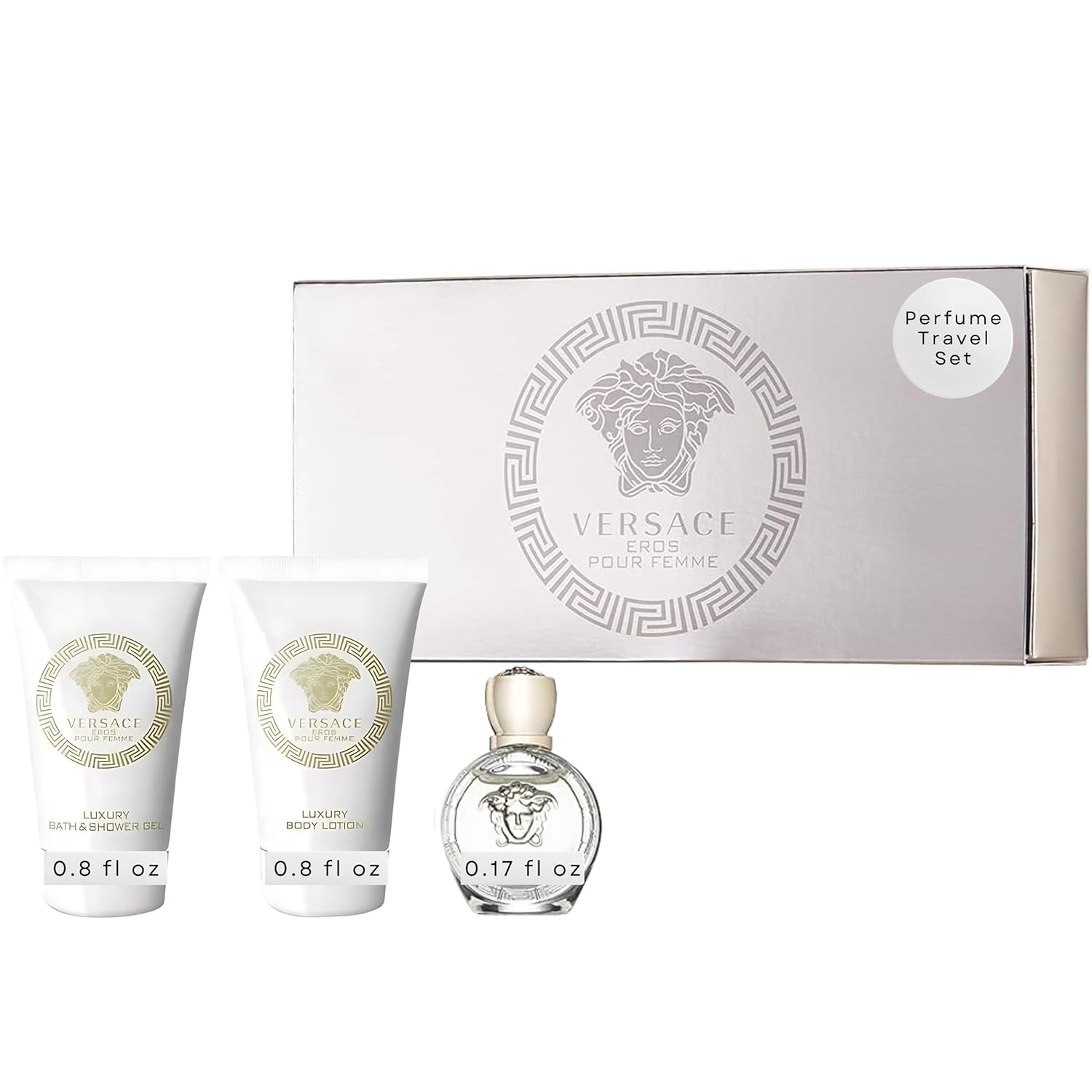 {"about_product": ["VERSACE FRAGRANCE COLLECTION – A curated set featuring the iconic Dylan Blue scent.", "DYLAN BLUE TRIO – Includes EDP Spray 0.17 OZ, Body Lotion 0.8 OZ, and Shower Gel 0.8 OZ.", "PERFUME FOR WOMEN – A sophisticated, long-lasting scent designed for daily elegance.", "DESIGNER PERFUME SAMPLE SET – Try the Dylan Blue experience before choosing a full-size.", "TRAVEL SIZE – Perfect for travel, gym, or on-the-go touch-ups."], "product_description": "Launched by the design house of Versace in the year 2012. This floral woody fragrance has a blend of Sicilian lemon Calabrian bergamot pomegranate lemon sambac jasmine absolute jasmine infusion peony musk and various woody notes.", "product_information": {"ASIN": "B01B13GTGS", "Department": "Women", "Manufacturer": "Continental Cosmetique", "Customer Reviews": "4.5 4.5 out of 5 stars \n\n (1,312)", "Best Sellers Rank": "#40,227 in Beauty & Personal Care (See Top 100 in Beauty & Personal Care) #137 in Women's Fragrance Sets", "Item model number": "8011003823574", "Is Discontinued By Manufacturer": "No"}, "product_details": {"Brand": "Versace", "Scent": "Eros Pour Femme", "Item Form": "Gel", "Item Volume": "0.17 Fluid Ounces", "Special Feature": "Travel Size"}}