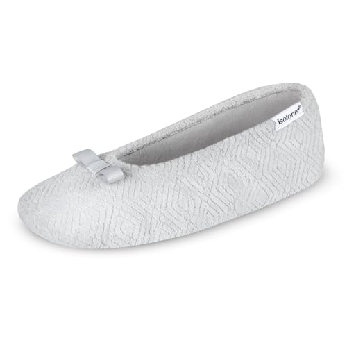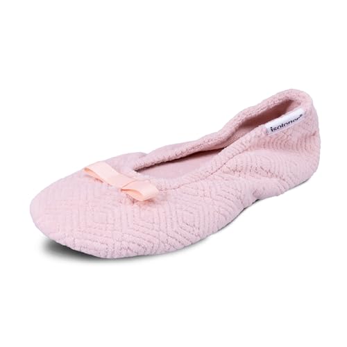 {"about_product": ["SIZE AND FIT: This style runs slightly small. For the best fit and all-day comfort, we recommend sizing up, especially if you are between sizes or prefer a little extra wiggle room.", "PLUSH COMFORT: Unwind in soft luxury with these ballerina slippers, crafted from rich micro terry cloth and detailed with an elegant chevron pattern. Designed for cozy, all-day wear—perfect for lounging, reading, or winding down in style.", "SECURE & SLIP RESISTANT: Designed with your safety in mind, these slippers stay comfortably in place while offering non-slip stability. Whether you’re tidying up or relaxing, you’ll move with ease and confidence around the house.", "TIMELESS SILHOUETTE: This ballerina silhouette paired with a dainty bow adds a graceful, elegant touch to your at-home wardrobe. Stylish enough to feel dressed up, comfy enough to wear from morning to night.", "EASY-CARE CONVENIENCE: Keep your slippers looking fresh—simply toss them in the wash for quick, effortless cleaning whenever needed. Machine wash cool; dry flat away from heat.", "BREATHABLE DESIGN: Stay dry and cozy with the moisture-wicking lining that keeps your feet fresh. Paired with a classic suede outsole, these slippers offer soft support and flexible comfort that moves with you."], "product_description": "Step into elegance with theDiamond Microterry Gemma Ballerina Slipper—your perfect companion for those small, graceful moments that make each day feel a little brighter. The sculpted diamond patterned microterry knit upper and PillowStep memory foam are as gentle and soft as a dancers movements. With a genuine suede, pig split indoor outsole and a timeless ballerina silhouette, the Gemma slippers are as seasonless as they are stylish. Whether you are sipping morning coffee or winding down after a long day, these slippers bring a little grace to every moment.", "product_information": {"ASIN": "B01IPEWPUU", "Department": "womens", "Manufacturer": "Isotoner", "Customer Reviews": "4.5 4.5 out of 5 stars \n\n (15,419)", "Best Sellers Rank": "#1,115 in Clothing, Shoes & Jewelry (See Top 100 in Clothing, Shoes & Jewelry) #53 in Women's Slippers", "Item model number": "96051", "Package Dimensions": "10 x 8.3 x 0.7 inches; 1.8 ounces", "Date First Available": "September 29, 2016"}, "product_details": {"Origin": "Imported", "Sole material": "Suede", "Inner material": "Moisture-wicking Fabric", "Outer material": "Synthetic"}}