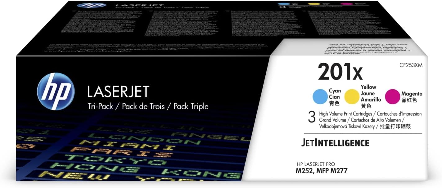 {"about_product": ["HP Ink Cartridges are engineered to work with HP printers to provide consistent quality, reliability and value", "Works with these HP Printers: Color LaserJet Pro MFP M277,M274,M252", "Cartridge yield (approx.): 2,300 pages per color", "Use HP Toner Cartridges to eliminate toner leaks and premature failures", "88% of HP ink cartridges are manufactured with recycled plastic"], "product_description": "Expect professional-quality documents when you use Original HP printer cartridges. Dependable performance, consistent page yields, and standout results. With Original HP Toner cartridges, you can also avoid reprints and help ensure the amazing performance you expect from your HP printer. These toner cartridges for HP printers are used for office, business, and professional printing. It is capable of high capacity, secure chip technology, as well as anti-malware performance. These office supplies are used to reduce downtime, keep printer secure, and ensure consistent outputs. Be confident that Original HP Toner Cartridges provide the printing experiences crucial for productivity in your office. Count on high-quality, reliable printing and save time by avoiding common printing problems.", "product_information": {"UPC": "190780321362", "ASIN": "B01MQXPZ5R", "Series": "CF253XM", "Language": "English", "Page Yield": "2300", "Item Weight": "4.96 pounds", "Manufacturer": "HP", "Special Feature": "High Yield", "Best Sellers Rank": "#20,870 in Office Products (See Top 100 in Office Products) #231 in Printer Toner Cartridges", "Item model number": "CF253XM", "Product Dimensions": "11.34 x 14.29 x 4.37 inches", "Date First Available": "December 21, 2016", "Number of Processors": "1", "Compatibility Options": "Genuine", "Item Dimensions LxWxH": "11.34 x 14.29 x 4.37 inches", "Printer Model Compatibility": "HP Color LaserJet Pro M252, HP Color LaserJet Pro M252DW, HP Color LaserJet Pro MFP M277C6", "Is Discontinued By Manufacturer": "No", "Global Trade Identification Number": "00190780321362"}, "product_details": {"Brand": "HP", "Color": "Cyan, Yellow, Magenta", "Item Weight": "5 Pounds", "Compatible Devices": "Works with these HP Printers: Color LaserJet Pro MFP M277,M274,M252", "Included Components": "What's in the box: New Original HP (genuine) toner cartridge, recycling guide"}}