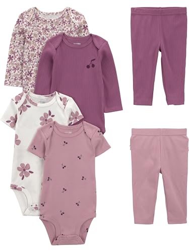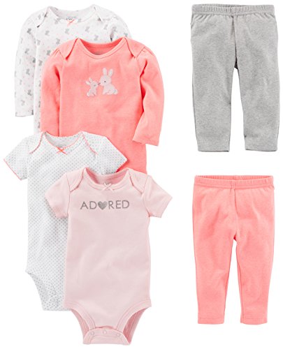 {"about_product": ["6-piece clothing set: Includes 2 short sleeve bodysuits, 2 long sleeve bodysuits, and 2 pair of pants.", "Snap closures: Reinforced snaps along the bottom make diaper changes quick and easy.", "Overlap shoulders: Expandable neckline with envelope-style shoulders allows for hassle-free dressing.", "Ruffle bottom design: Stylish, playful ruffles on the pants give a cute look to your baby’s outfit.", "Fun prints and patterns: Adorable, vibrant prints and patterns for a cheerful and stylish look.", "Tagless design: No scratchy tags, ensuring extra comfort for the baby."], "product_description": "This Simple Joys by Carter's 6-piece Bodysuits and Pants Set for Baby Girl is the perfect addition to your little one's wardrobe, combining style, comfort, and practicality. This adorable set includes 2 short sleeve bodysuits, 2 long sleeve bodysuits, 1 pair of pants with a cute ruffle bottom and another pair of cute pants, giving you endless mix-and-match possibilities. Each bodysuit features convenient snap closures for easy diaper changes and overlap shoulders for quick, hassle-free dressing. The soft fabric ensures your baby stays comfortable throughout the day, whether she's at play or napping. Designed with fun prints and playful patterns, this set is both stylish and versatile, making it ideal for everyday wear. The pants add an extra touch of charm with their sweet ruffle detail, making this set not only practical but also perfect for photo-worthy moments. Machine washable and made to last, this 6-piece outfit set from Carter's offers exceptional value and timeless style for your baby girl.", "product_information": {"ASIN": "B0CR2Y832G", "Department": "baby-girls", "Manufacturer": "Carter's Simple Joys - Private Label", "Customer Reviews": "4.8 4.8 out of 5 stars \n\n (30,717)", "Best Sellers Rank": "#334 in Our Brands (See Top 100 in Our Brands) #3 in Baby Girls' Pant Sets", "Date First Available": "December 28, 2023"}, "product_details": {"Origin": "Imported", "Fabric type": "Pink-Pant: 60% Cotton, 40% Polyester; Pink-Bodysuit: 60% Cotton, 40% Polyester; Others: 100% Cotton", "Care instructions": "Machine Wash"}}