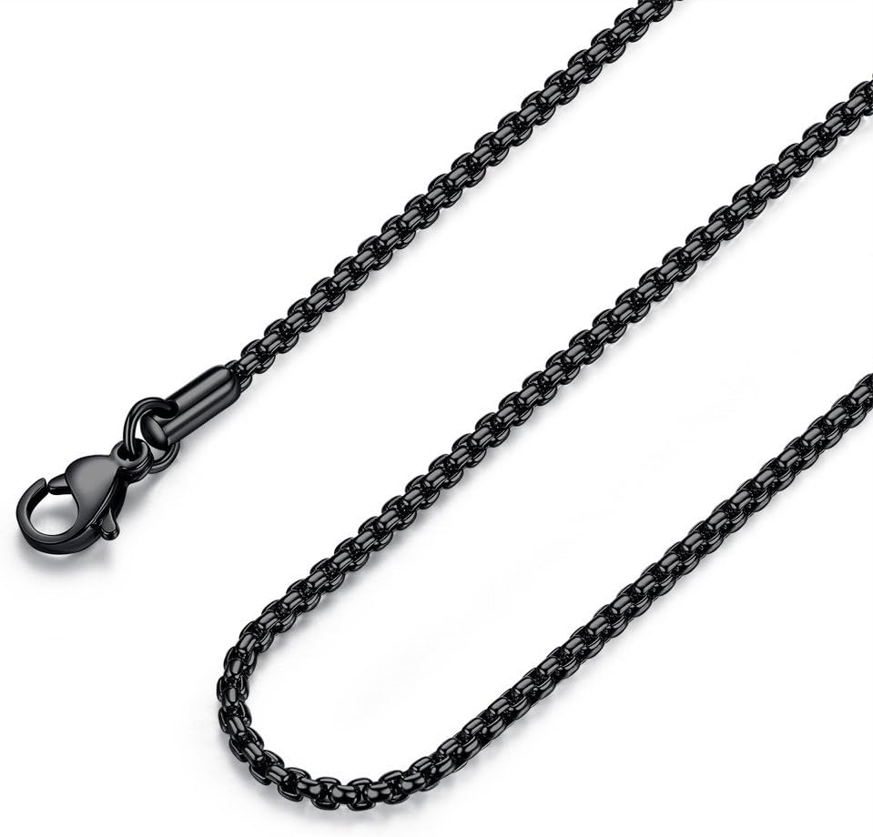 {"about_product": ["Long Time Color-Retaining and Maintenance free--- This black chain for men with excellent plating craftsmanship keeps its glossy color for long time, sturdy men chain necklace for daily wear with or without a pendant, matches well with your casual or formal outfits. No need to take it off when bathing, sleeping or doing sports. No need to worry about fading.", "Hypoallergenic and comfortable---This mens chain made of 316L surgical steel designed with round links features a box chain. The stainless steel necklace brings out a cool and elegant look. Hand high polished surface and smooth edges, comfortable and hypoallergenic.", "Dimension and Notice---Stainless steel chain width-2mm/0.08inch, thickness-2mm/0.08inch, length-24inch/60cm. Multiple widths and lengths mens necklace for choosing. NOTICE--End of chain is equipped with a ring. Ring diameter: 7mm for 2mm/3mm-wide chains. Verify pendant hole size prior to pairing with a pendant. It is not easy to reattach the end ring once it has been removed by the customer themselves, so we generally advise against handling the chain without professional assistance.", "Perfect Gift--- Necklace for men women who appreciates simple and elegant black jewelry. Perfect gift idea for men, women, Xmas Day, Birthday Day, Anniversary, alentines Day, Father’s Day, Mother’s Day.", "Customer Service---If You Are Not Completely Satisfied With Our Products, Please contact us immediately, we will solve it for you within 24 hours."], "product_description": "FOSIR Stainless Steel Black Round Box Chain Necklace for Men Women, Square Rolo Chain for Men. \n-Made of High-Grade stainless steel skin-friendly, comfort fit and hypoallergenic. \nHand high polished and one by one quality controlled. \nA range of length variations,and five width variations, timeless essential necklace for men and women, suitable for most occations. \nSmooth edges, comfortable to wear with or without a pendant as a daily jewelry. \nIf You Are Not Completely Satisfied With Our Products, Please contact us immediately, we will solve it for you within 24 hours.", "product_information": {"ASIN": "B0B9KWVQCM", "Department": "mens", "Customer Reviews": "4.4 4.4 out of 5 stars \n\n (11,288)", "Product Warranty": "For warranty information about this product, please click here", "Best Sellers Rank": "#9,983 in Clothing, Shoes & Jewelry (See Top 100 in Clothing, Shoes & Jewelry) #51 in Men's Necklaces", "Date First Available": "August 14, 2022"}, "product_details": {"Gem type": "No Gemstone", "Material": "Stainless Steel", "Chain type": "Rolo", "Item width": "2 millimeters", "Metal type": "Stainless Steel", "Item display length": "24 inches"}}