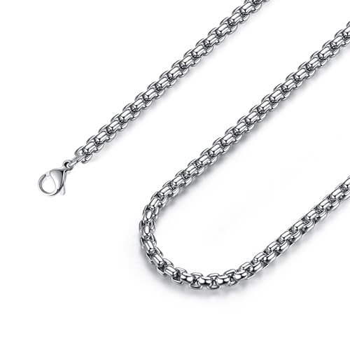 {"about_product": ["Stylish and Durable : This rolo chain designed with round links and end wrapped is paired well with your casual or formal outfit, upgrade your look effortlessly. Stylish stainless steel necklace for men, strong and durable daily jewelry piece.", "Hypoallergenic and Notice : Round box chain necklace made of 316L premium stainless steel with surface polished, this mens chain is comfortable and hypollergic for wearing. Nickel-free and Lead-free. NOTICE-- End of chain is equipped with a ring. Ring diameter: 7mm diameter for 2mm/3mm-wide chains, 8.5mm diameter for 4mm/5mm-wide chains. Verify pendant hole size prior to pairing with a pendant. It is not easy to reattach the end ring once it has been removed by the customer themselves, so we generally advise against handling the chain without professional assistance.", "Maintenance Free : This stainless steel chain made with excellent craftsmanship and handwork can keep its glossy color always, will not fade or tarnish . No need to take it off when bathing,sleeping or doing sports, no rust or tarnish.", "Dimension : Mens necklace Width: 2mm/0.08inch, Thickness: 2mm/0.08inch, Length: 18inch/45cm. Stainless steel chain with multiple widths (2/3/4/5mm) and lengths (16\"/18\"/20\"/22\"/24\"/26\"/28\"/30\") for choosing. Please choose the right size for yourself.", "Perfect Gift : Necklace for men who appreciates simple and elegant jewelry. Perfect gift idea for women,men, Xmas Day,Birthday Day, Anniversary,alentines Day, Father’s Day, Mother’s Day."], "product_description": "FOSIR Stainless Steel Square Rolo Chain Round Box Chain Necklace for Women Men, 2mm 3mm 4mm 5mm Round Box Chain for choosing, Silver Chain for Men Women. Made of High-Grade stainless steel skin-friendly, comfort fit and hypoallergenic. Hand high polished and one by one quality controlled. A range of length variations, and three width variations, suitable for men and women of all ages. Smooth edges, comfortable to wear with or without a pendant as a daily jewelry.", "product_information": {"ASIN": "B0B5QLDWJR", "Department": "mens", "Manufacturer": "FOSIR. JEWELRY. CO., LTD", "Customer Reviews": "4.4 4.4 out of 5 stars \n\n (1,490)", "Product Warranty": "For warranty information about this product, please click here", "Best Sellers Rank": "#14,429 in Clothing, Shoes & Jewelry (See Top 100 in Clothing, Shoes & Jewelry) #85 in Men's Necklaces", "Item model number": "F3N-02XNM", "Date First Available": "July 4, 2022"}, "product_details": {"Gem type": "No Gemstone", "Material": "Stainless Steel", "Chain type": "Rolo", "Item width": "2 millimeters", "Metal type": "Stainless Steel", "Item display length": "18 inches"}}