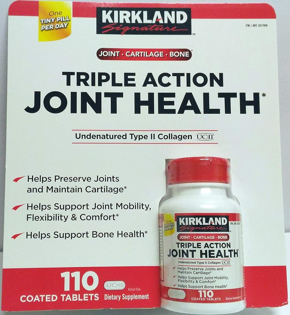 {"about_product": ["UCll Undenatured Type II Collagen, Boron, Hyaluronic Acid", "Helps Preserve Joints and Maintain Cartilage", "Helps Support Joint Mobility, Flexibility and Comfort", "Helps Support Bone Health"], "product_description": "Maintaining joint health requires a supplement capable of multi-tasking. The UCII undenatured type II collagen in Kirkland Signature Triple Action Joint Healthcan make a real difference in helping you feel better and stay more active, all in one tiny pill.", "product_information": {"ASIN": "B071HGCTC1", "Manufacturer": "Kirkland Signature", "Customer Reviews": "4.7 4.7 out of 5 stars \n\n (1,149)", "Best Sellers Rank": "#30,397 in Health & Household (See Top 100 in Health & Household) #248 in Collagen Supplements", "Item model number": "GN-63EI-HE5S", "Product Dimensions": "2 x 2 x 3.7 inches; 1.6 ounces", "Date First Available": "September 14, 2016", "Is Discontinued By Manufacturer": "No"}, "product_details": {"Brand": "KIRKLAND", "Flavor": "Unflavored", "Diet Type": "Gluten Free", "Item Form": "Softgel", "Unit Count": "110 Count", "Item Weight": "1.6 Ounces", "Product Benefits": "Bone & Joint Support", "Special Ingredients": "Collagen", "Primary Supplement Type": "COLLAGEN", "Item dimensions L x W x H": "2 x 2 x 3.7 inches"}}