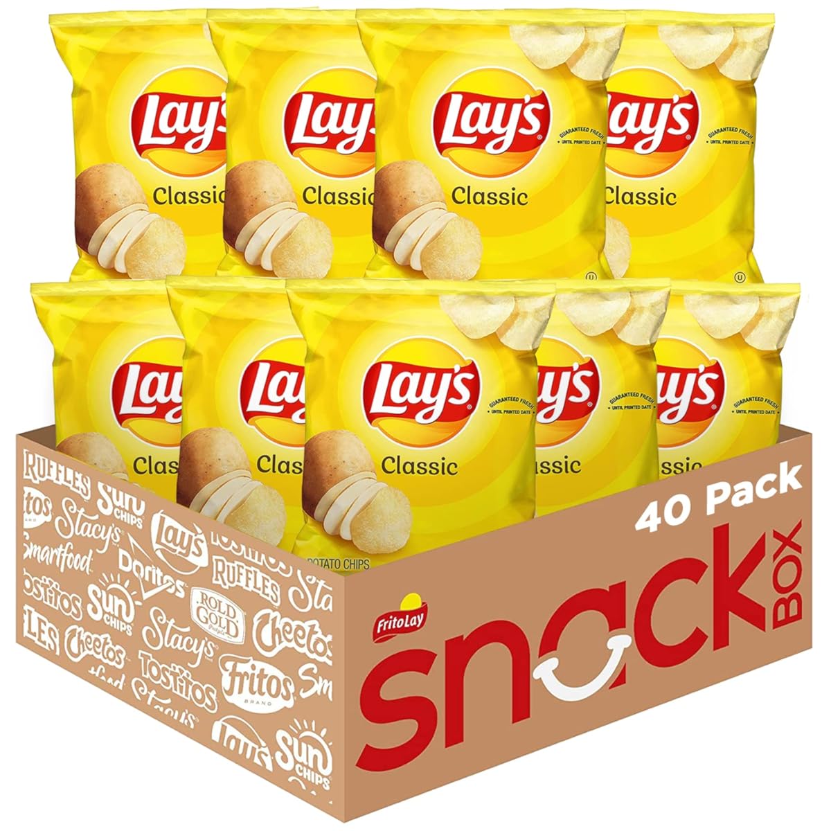 {"about_product": ["Pack of 40 one ounce bags", "Made with three ingredients: potatoes, oil and salt", "Gluten free. State of Readiness: Ready to Eat", "These much loved treats are fun to enjoy at lunch, as an after-school snack, or party refreshment", "Easy to carry, easy to store, and easy to pack", "For a limited time, packaging may vary"], "product_description": "The perfectly crispy chip that has been America's favorite snack for more than 75 years. Wherever celebrations and good times happen, the Lay's brand will be there. With flavors almost as rich as our history, we have a chip or crisp flavor guaranteed to bring a smile on your face. Lays Classic potato chips are the perfect snack for any occasion. Provide the perfect portion size and classic taste to keep your customers, colleagues, and family happy. From store shelves, to the pantry, to the lunch box, all you have to do is grab a pack and go.", "product_information": {"UPC": "028400675994", "ASIN": "B072M1NC4M", "Units": "40 Count", "Manufacturer": "Frito-Lay (Retail Selection)", "Customer Reviews": "4.5 4.5 out of 5 stars \n\n (77,044)", "Best Sellers Rank": "#133 in Grocery & Gourmet Food (See Top 100 in Grocery & Gourmet Food) #2 in Potato Chips & Crisps", "Product Dimensions": "13.25 x 16.25 x 19.25 inches; 2.5 Pounds", "Is Discontinued By Manufacturer": "No"}, "product_details": {"Type": "Potato Chip", "Brand": "Lay's", "Flavor": "Classic", "Unit Count": "40 Count", "Number of Items": "1"}}