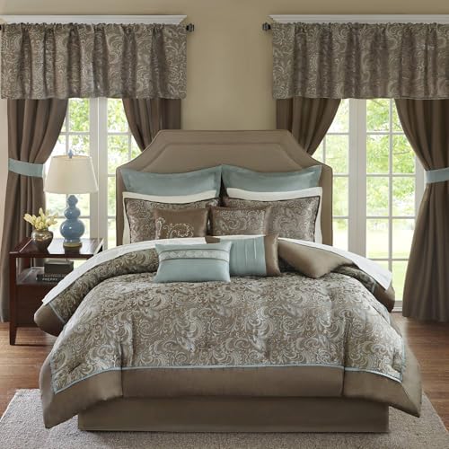 {"about_product": ["100% Polyester", "STYLE - Modern traditional elegant style cozy comforter set so you can update your bedroom decor with a luxurious room décor Faux silk with jacquard paisley design added luxurious fabric texture complement this classic traditional styling comforter The matching ensembles for the entire bedroom mirror the design of the comforter while the solid color reverse balances the look 4 decorative pillows in embroidery design and pleating details complete the look of this classic traditional style comforter set", "MATERIAL - Feel the gentle faux silk comforter set which offers ultra soft feel and luxurious jacquard texture bedding cover The faux silk fabric will also make you feel extra cozy giving you a better quality rest every night", "ALL SEASON - Our all season comforter sets offers a soft fabric reverse Madison Park Essentials bedding collection aims to offer you a better quality sleeping experience With the right amount of hypoallergenic down alternative filling our cozy bedspread will give you the right amount of warmth and comfort for year round use", "Set includes: 1 Comforter:90\"W x 90\"L, 2 Standard Shams:20\"W x 26\"L, 1 Bedskirt:60\"W x 80\"L plus 15\"D, 4 Decorative Pillows: 16\"W x 16\"L (1) /12\"W x 18\"L (2) /18\"W x 18\"L (1) 2 Euro Shams:26\"W x 26\"L plus 2\"D, 1 Flat Sheet:90\"W x 102\"L, 1 Fitted Sheet:60\"W x 80\"L plus 14\"D, 2 Standard Pillowcases:20\"W x 30\"L, 4 Window Panels:42\"W x 84\"L, 4 Tie Backs:4\"W x 23\"L, 2 Valances:18\"W x 54\"L", "Care instructions: Machine wash, gentle cycle and separately. Spot clean decorative pillows. Do not bleach. Tumble dry low, remove promptly. Do not iron. If there is no free movement in the washer or dryer, use large capacity commercial washer/dryer."], "product_description": "The Madison Park Essentials Brystol 24 Piece Room in a Bag provides a total makeover for your bedroom decor. This traditional comforter flaunts a teal and grey jacquard paisley pattern with an accenting solid teal border to create a luxurious glam look. Matching pillow shams and solid teal Euro shams with 2-inch flanges coordinate beautifully with the elegant comforter. A solid grey bed skirt and 4 decorative pillows with embroidery and pleating details add the finishing touches to this paisley bedding set. Polyester filling in the comforter and pillows contains no allergens and is treated to be dustproof. A 4 Piece sheet set is also included to complement the comforter and complete the jacquard bedding set. To elevate your bedroom, 4 solid teal window curtains with 2 paisley valances and 2 solid tiebacks are included to perfectly style your windows. Machine washable for easy care, this paisley comforter set may come in rolled or compressed packing and will need to be fluffed up. Use a steam iron to help remove wrinkles easier. Spot clean pillows.", "product_information": {"UPC": "086569914194", "ASIN": "B073W9HBGV", "Size": "Queen (90 in x 90 in)", "Brand": "Madison Park", "Color": "Teal", "Style": "Traditional", "Theme": "Floral", "Refill": "polyester", "Pattern": "Paisley", "Seasons": "All", "Material": "Polyester", "Fabric Type": "100% Polyester", "Item Weight": "17.18 pounds", "Manufacturer": "Madison Park Essentials", "Specifications": "certified frustration-free", "Number of Pieces": "24", "Assembly required": "No", "Best Sellers Rank": "#51,440 in Home & Kitchen (See Top 100 in Home & Kitchen) #241 in Bedding Comforter Sets", "Item model number": "MPE10-636", "Pillowcase Length": "30 Inches", "Batteries required": "No", "Fitted Sheet Depth": "14 Inches", "Product Dimensions": "90 x 90 x 1.5 inches", "Included Components": "1 Comforter,2 Standard Shams,1 Bedskirt,2 Euro Shams,4 Decorative Pillows,1 Flat Sheet,1 Fitted Sheet,2 King Pillowcases,4 Window Panels,4 Tiebacks,2 Valances", "Item dimensions L x W x H": "90 x 90 x 1.5 inches", "Product Care Instructions": "Machine Wash, Spot Clean Pillows", "Is Discontinued By Manufacturer": "No", "Global Trade Identification Number": "00086569914194"}, "product_details": {"Size": "Queen (90 in x 90 in)", "Brand": "Madison Park", "Color": "Teal", "Style": "Traditional", "Included Components": "(function(f) {var _np=(window.P._namespace(\"DetailPageProductOverviewTemplatesJava\"));if(_np.guardFatal){_np.guardFatal(f)(_np);}else{f(_np);}}(function(P) { P.when('A').execute(function(A){ A.on('a:truncate:po-attribute-truncate-1:updated', function(data) { var isTruncated = !data.truncateInstance.getIfTextFits(); var seeMoreElement = document.getElementById('po-attribute-see-more-id-1'); if(seeMoreElement) { seeMoreElement.style.display = isTruncated ? '' : 'none'; } }) }); })); 1 Comforter,2 Standard Shams,1 Bedskirt,2 Euro Shams,4 Decorative Pillows,1 Flat Sheet,1 Fitted Sheet,2 King Pillowcases,4 Window Panels,4 Tiebacks,2 Valances See more"}}