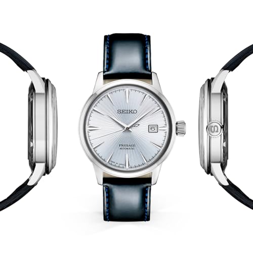 {"about_product": ["SILVER DIAL: this men's automatic watch features a light deep, pressed pattern with a gloss finish surrounded by a stainless steel watch case", "AUTOMATIC: these self-winding, automatic men's watches are powered by your movement, with a power reserve of 41 hours", "STAINLESS STEEL & LEATHER: features a durable stainless steel watch case paired with a black leather watch band", "WATER-RESISTANT: these men's wrist watches are water-resistant down to 50 meters", "4R35 CALIBER: equipped with the reliable caliber 4R35 automatic movement, this accurate men's watch keeps precise time"], "product_description": "Offering the finest in Japanese mechanical watchmaking, the Presage Collection blends precision technology with superior craftsmanship and design. Taking a more playful approach to the popular Cocktail theme line, this delightful watch is part of a group reflecting the casual charm of a vacation bar. Inspired by the Mojito cocktail, its graduated rich green dial features a pressed pattern reminiscent of the light reflected by a classic cocktail glass, as well as numerals styled to recall the printing on a vintage liquor label. With automatic and manual winding capabilities, it features a power reserve of approximately 41 hours. Crafted of stainless steel, this distinctive timepiece includes a date calendar, box-shaped crystal, screwdown see-through caseback, and a smooth tan leather strap with tri-fold push button release clasp. Water-resistant down to 50 meters (5 bar)", "product_information": {"ASIN": "B074KL28XK", "Batteries": "1 Product Specific batteries required.", "Department": "mens", "Manufacturer": "Seiko", "Customer Reviews": "4.6 4.6 out of 5 stars \n\n (905)", "Product Warranty": "For warranty information about this product, please click here", "Best Sellers Rank": "#52,047 in Clothing, Shoes & Jewelry (See Top 100 in Clothing, Shoes & Jewelry) #193 in Men's Wrist Watches", "Item model number": "SRPB43", "Product Dimensions": "5 x 5 x 4 inches; 10.55 ounces", "Date First Available": "August 4, 2017", "Is Discontinued By Manufacturer": "No"}, "product_details": {"Clasp type": "Foldover Clasp With Push Button", "Item width": "5 inches"}}