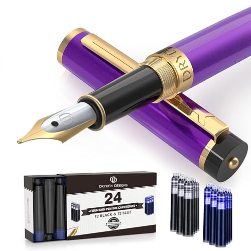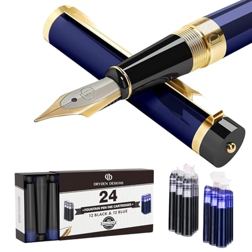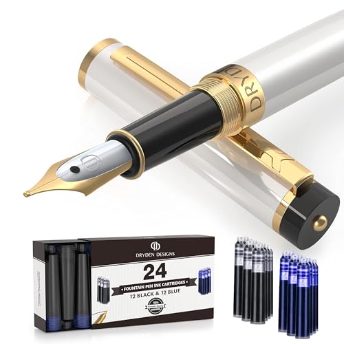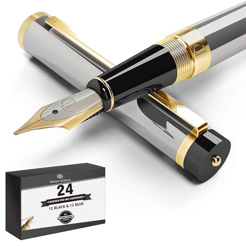 {"about_product": ["Sleek Design: The fountain pen features a modern and stylish round shape, made of durable stainless steel and a knurled grip for comfortable writing", "Included Ink: The pen comes with 24 high-quality ink cartridges, 12 black and 12 blue, providing a smooth and consistent writing experience", "Versatile Usage: Ideal for calligraphy, journaling, or signing, this pen is suitable for both left and right-handed writers, recommended for adult use", "Gift-Ready Packaging: Comes in an elegant gift pouch, making it a thoughtful present for professionals, writers, or pen enthusiasts.", "Refillable: Compatible with standard international ink cartridges or converters (sold separately), offering a sustainable and long-lasting writing solution."], "product_description": null, "product_information": {"ASIN": "B0774FLSD9", "Size": "1 Count (Pack of 1)", "Brand": "Dryden Designs", "Color": "Metallic Silver", "Closure": "Click-Off Cap", "Grip Type": "Knurled", "Ink Color": "Blue", "Line Size": "0.5mm", "Point Type": "Medium", "Item Weight": "1.6 ounces", "Manufacturer": "Dryden Designs", "Material Type": "Stainless Steel", "Number of Items": "1", "Best Sellers Rank": "#6,170 in Office Products (See Top 100 in Office Products) #19 in Fountain Pens", "Item model number": "Dryden Designs", "Product Dimensions": "6.4 x 2 x 0.4 inches", "Date First Available": "November 3, 2017", "Manufacturer Part Number": "Dryden Designs", "Is Discontinued By Manufacturer": "No"}, "product_details": {"Brand": "Dryden Designs", "Color": "Metallic Silver", "Ink Color": "Blue", "Age Range (Description)": "All Ages", "Writing Instrument Form": "Fountain Pen"}}