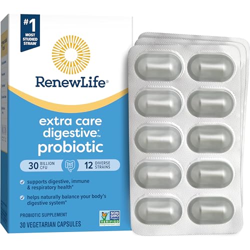 {"about_product": ["PROBIOTIC: Includes one 60-count bottle of vegetarian capsules of Renew Life Extra Care Probiotic Capsules 30 Billion CFU for respiratory, digestive health and immune support (1)", "CLINICALLY TESTED STRAINS: Probiotic supplement with a blend of 12 different strains to support digestive, respiratory and immune health", "DIVERSE FORMULA: Daily probiotic with more clinically studied strains than the leading brand (2) to provide science-backed benefits", "12 DIVERSE STRAINS: Contains 12 Bifido and Lacto probiotic strains, including B. lactis Bl-04 for respiratory health and the No. 1 most studied strain, L. rhamnosus GG - for gut and immune health (3)", "MULTIPLE BENEFITS: Provides digestive support, promotes immune health and promotes respiratory health, all in a smaller, easier-to-swallow capsule", "TESTED AND FORMULATED: Includes 30 billion cultures and world-class strains that are clinically tested and formulated by microbiologists and researchers", "TOP-QUALITY: These delayed-release pills help ensure the probiotics reach your gut alive and guarantee potency, quality and purity through the expiration date", "HOW TO USE THESE PROBIOTICS: For best results, take one capsule daily, with or without food; refrigeration is recommended, but not required", "GLOBAL INGREDIENTS: Created with the highest quality global ingredients, this men's and women's probiotic has a Non-GMO Project Verified formula that is gluten-free, dairy-free and soy-free", "FEELING GUTSY FOR 25 YEARS AND COUNTING: Renew Life puts health and wellness first with daily supplements that are backed by over 25 years of clinical trials"], "product_description": "Renew Life Extra Care Digestive Probiotic offers 12 probiotic strains in easy-to-swallow capsules to promote immune, respiratory and digestive health (1). Featuring more clinically studied strains than the leading brand (2), these men's and women's probiotic pills contain a blend of 12 different probiotic strains including L. rhamnosus GG, the No. 1 most studied strain (3). With 30 billion cultures, these Renew Life probiotic capsules make it easy to support digestive, respiratory and immune health. Each strain is clinically tested and formulated by microbiologists and researchers to offer science-backed benefits. Potency, quality and purity are guaranteed through the expiration date. This Non-GMO Project Verified daily probiotic supplement comes in small, easy-to-swallow capsules that are gluten-free, dairy-free and soy-free. Renew Life puts health and wellness first with supplements that are backed by over 25 years of clinical trials. (1) These statements have not been evaluated by the Food and Drug Administration. This product is not intended to diagnose, treat, cure or prevent any disease. (2) Based on IRI unit sales data, January 2021. (3) L. rhamnosus GG strain, PubMed Clinical Trials, August 2019.", "product_information": {"ASIN": "B07B11HQF8", "Manufacturer": "Renew Life", "Customer Reviews": "4.6 4.6 out of 5 stars \n\n (10,872)", "Best Sellers Rank": "#11,916 in Health & Household (See Top 100 in Health & Household) #91 in Acidophilus Nutritional Supplements", "Item model number": "631257120267", "Product Dimensions": "2.38 x 2.38 x 4.5 inches; 2.9 ounces", "Date First Available": "February 20, 2018", "Is Discontinued By Manufacturer": "No"}, "product_details": {"Brand": "Renew Life", "Flavor": "30 Billion CFU", "Diet Type": "Gluten Free", "Item Form": "Capsule", "Unit Count": "60 Count", "Item Weight": "2.9 Ounces", "Product Benefits": "Immune Support", "Special Ingredients": "Probiotic", "Primary Supplement Type": "Probiotic", "Item dimensions L x W x H": "2.38 x 2.38 x 4.5 inches"}}