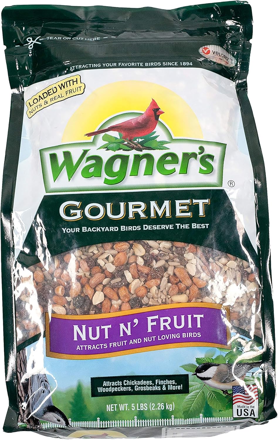 {"about_product": ["5-highly nutritious foods that will attract a wide variety of birds to your backyard", "An all-natural, high-quality mix filled with the healthy proteins and fats birds crave", "Loaded with natural fruits and nuts for a hearty and satisfying bird treat", "Created to attract both small and large beak colorful songbirds including cardinals, chickadees, jays and more", "A select mix of foods that will provide year-round entertainment for you and healthy energy for your backyard birds"], "product_description": "Wagner's Nut 'N Fruit Gourmet series blend has been specially created to attract a wide variety of birds to your feeding area. This blend contains all edible, highly nutritious ingredients providing birds the high energy they need. The fruit content of the blend can draw non-seed eating birds adding to your viewing enjoyment. Finally, you will not get shell waste or seed growth which makes this food great for decks, porches and patios", "product_information": {"ASIN": "B07DBC9JF8", "Size": "5 lb (Pack of 1)", "Style": "Bird Food", "Brand Name": "Wagner's", "Directions": "Place the bird food in a bird feeder", "Model Name": "Wagner's 82072 Gourmet Nut & Fruit", "Item Weight": "5 Pounds", "Manufacturer": "Wagner's", "Number of Items": "1", "Item model number": "82072", "Breed Recommendation": "Small Breeds", "Date First Available": "May 26, 2018", "Age Range Description": "All Life Stages", "Item Dimensions LxWxH": "13.54 x 11.42 x 2.56 inches", "Item Package Dimensions L x W x H": "13.27 x 9.45 x 3.94 inches"}, "product_details": {"Brand": "Wagner's", "Flavor": "Unflavored", "Item Form": "Seeds", "Special Ingredients": "Nutmeg", "Age Range (Description)": "All Life Stages"}}