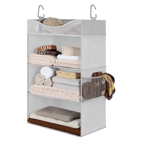 {"about_product": ["Features an extra top shelf, making for organizing purses, accessories, odds and ends, etc.", "Including a side pocket for storing keys, small gadgets, and other bits and pieces.", "Made of polyester blend fabric, reinforced with heavy-duty plastic board, plus strong metal hooks, the closet organizer can hold a weight of up to 30lbs without bending the top and holds up well over time.", "Hanging closet shelf for versatile storage of sweaters, knitwear, handbags, scarves, shirts, pants, hats, shoes, dorm essentials and more in the closets, trailers, college dorm, or RVs.", "Collapsible for compact storage when not in use."], "product_description": null, "product_information": {"UPC": "604776757443", "ASIN": "B07GWV4672", "Size": "12\" W x 12\" D x 35 ¼\"H", "Brand": "StorageWorks", "Color": "Grey", "Style": "Modern", "Room Type": "Bedroom, Closet Wardrobe, Dorm Room, Kids Room, Nursery", "Model Name": "StorageWorks 4008", "Unit Count": "1.0 Count", "Item Weight": "1.92 pounds", "Manufacturer": "StorageWorks", "Weight Limit": "30 Pounds", "Number of Items": "3", "Special Feature": "Durable, Foldable, Metal Hooks, Portable, Space Saving", "Weight capacity": "Maximum weight: 30 Pounds", "Furniture Finish": "Metal", "Assembly Required": "Yes", "Best Sellers Rank": "#157,466 in Home & Kitchen (See Top 100 in Home & Kitchen) #100 in Hanging Shelves", "Installation Type": "hanging", "Item model number": "SW4008", "Number of Shelves": "3", "Product Dimensions": "12\"D x 12\"W x 35.25\"H", "Included Components": "Metal Hooks", "Date First Available": "August 28, 2018", "Product Care Instructions": "Wipe with Dry Cloth", "Specific Uses For Product": "Clothes, Decorative Items, Jewelry, Shoes, Toys", "Recommended Uses For Product": "Home Decor, Storage", "Is Discontinued By Manufacturer": "No", "Assembly Instructions Description": "No assembly required. Simply unfold and hang on closet rod.", "Global Trade Identification Number": "00604776757443"}, "product_details": {"Brand": "StorageWorks", "Shape": "Rectangular", "Style": "Modern", "Material": "Fabric", "Room Type": "Bedroom, Closet Wardrobe, Dorm Room, Kids Room, Nursery", "Shelf Type": "Hanging Shelf", "Mounting Type": "Hanging Organizer", "Special Feature": "Durable, Foldable, Metal Hooks, Portable, Space Saving", "Number of Shelves": "3", "Product Dimensions": "12"D x 12"W x 35.25"H"}}
