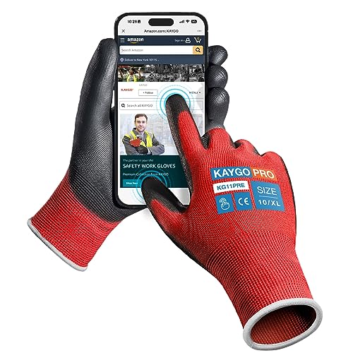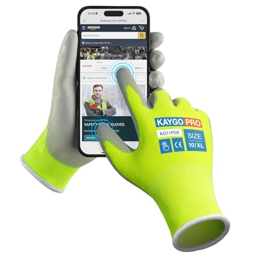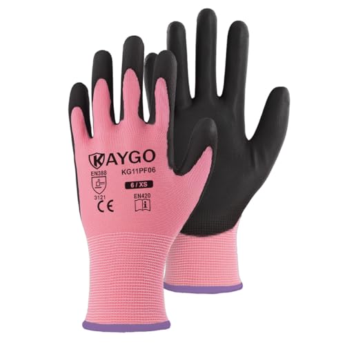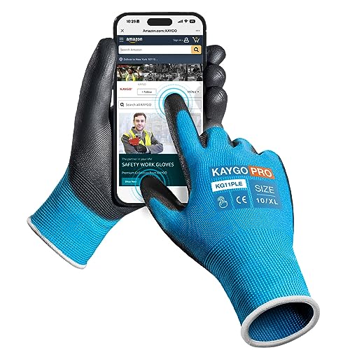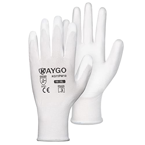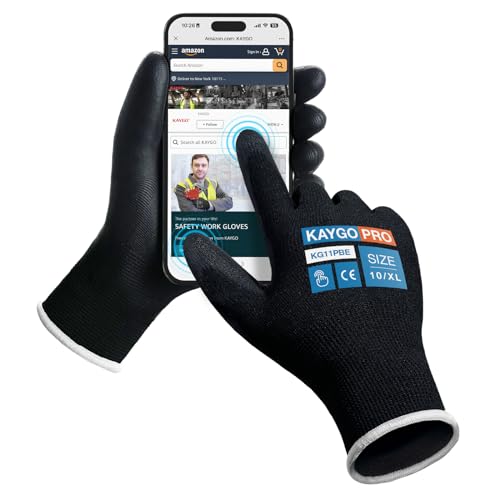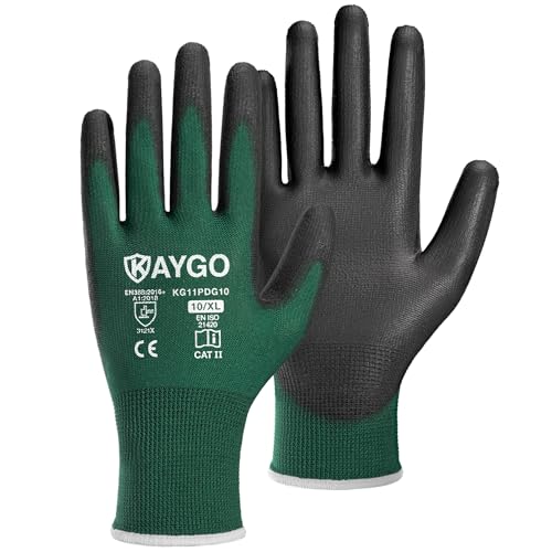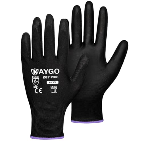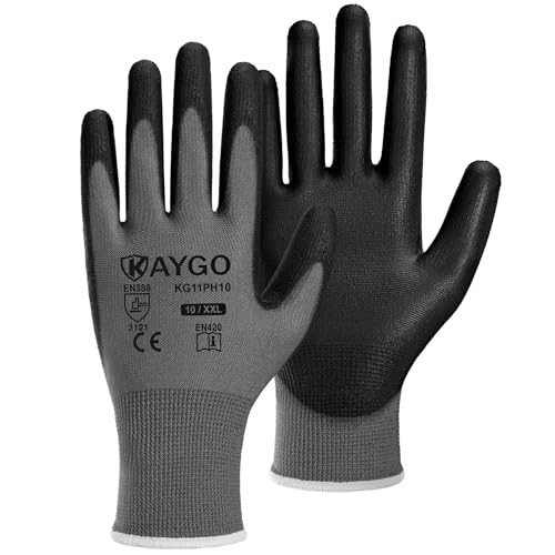 {"about_product": ["Comfortable and Breathable: The 13-gauge seamless knit shell offers excellent comfort, finger dexterity, and breathability. These gloves fit a wide range of hand sizes, ensuring a comfortable and snug fit for both men and women", "Excellent Abrasion Resistance: The polyurethane-coated palms and fingertips provide a secure grip in dry and slightly wet/oily conditions while maintaining high dexterity and tactile sensitivity, making them ideal for precise tasks", "Versatile Applications: Perfect for light to medium-duty tasks such as general-purpose work, DIY, assembly, auto repair, warehouse duties, home improvement, yard work, gardening, and cleaning", "Compliance with Safety Standards: PU gloves and Nitrile gloves: CE EN388 3121 certified, providing enhanced protection for various tasks", "Care Instructions: Wash gloves in lukewarm water (below 104°F/40°C) using mild, non-ionic detergent. Wash for 5-10 minutes in a gentle cycle, rinse with cold water, and tumble dry at temperatures not exceeding 140°F/60°C to maintain glove integrity"], "product_description": null, "product_information": {"ASIN": "B07P1R36HH", "Size": "Large (Pack of 12)", "Color": "Black", "Style": "Utility", "Material": "Polyurethane,Polyester", "Item Weight": "12 ounces", "Part Number": "KG11P", "Manufacturer": "KAYGO", "Number Of Pieces": "24", "Special Features": "Breathable, Lightweight, Palm Coated", "Best Sellers Rank": "#1,643 in Tools & Home Improvement (See Top 100 in Tools & Home Improvement) #25 in Safety Work Gloves", "Item model number": "KG11P", "Package Dimensions": "10.2 x 4.72 x 4.25 inches", "Batteries Included?": "No", "Batteries Required?": "No", "Date First Available": "February 24, 2019", "Warranty Description": "1 year", "Item Package Quantity": "1"}, "product_details": {"Size": "Large (Pack of 12)", "Brand": "KAYGO", "Color": "Black", "Material": "Polyurethane,Polyester", "Special Feature": "Breathable, Lightweight, Palm Coated"}}