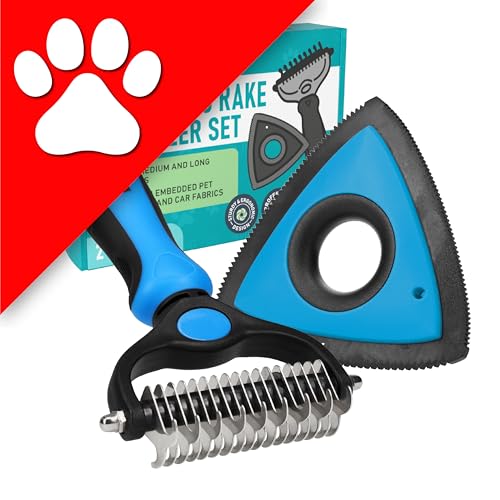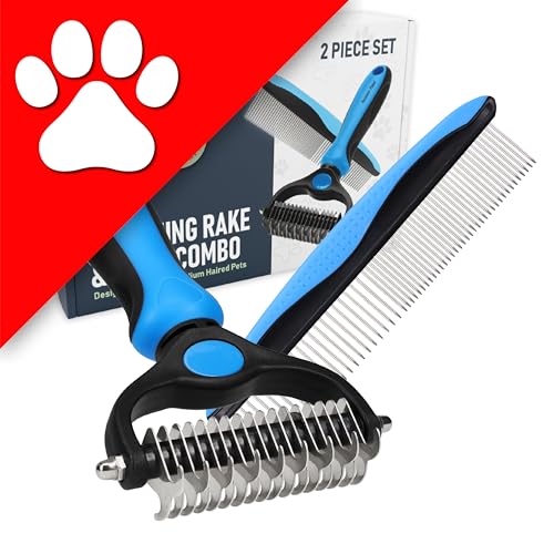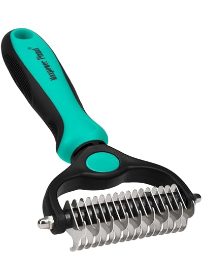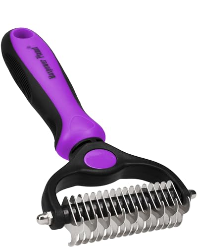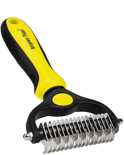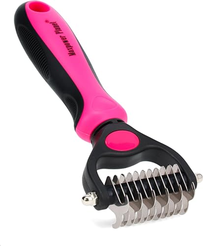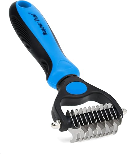 {"about_product": ["USA OWNED AND OPERATED: From our home in Florida, we’ve proudly sold over 1 million grooming rakes to pet parents nationwide. We’re deeply committed to creating products that not only care for your pets but also help strengthen the special bond you share with them.", "DUAL-SIDED DESIGN: Our grooming brush is perfect for dematting and deshedding your pet's coat! With a dual-sided design, use the 9-teeth side to tackle stubborn mats and tangles and the 17-teeth deshedding tool side to thin out your pet's fur. Gently desheds and removes loose hair and eliminates tangles, knots, dander, and trapped dirt keeping your dog looking their best.", "EFFECTIVE DESHEDDING TOOL & COMFORTABLE TO USE: The perfect cat brush or dog grooming brush solution for pets with thick fur or dense double coats. This grooming rake for dogs is designed with a lightweight, comfortable, non-slip rubber handle to keep the brush from moving around as you groom your pet.", "NOT INTENDED FOR SHORT HAIRED CATS OR SHORT COAT DOG BREEDS: Our rake is designed specifically for long coats, wiry coats, and double coats. The deshedding rake for dogs and cats allows you to easily and safely remove mats, tangles, knots, and loose hair when used as directed. For use on long haired and thick coat breeds of pets.", "INSTRUCTIONS ON HOW TO USE: Using minimal pressure, glide along fur to remove tangles, and mats. 9 Teeth side for dematting and 17 for deshedding. When using on loose skin, be sure to pull loose skin tight to prevent catching on the blade. Its important to let the rake do the work and to use short gentle strokes on your pet."], "product_description": null, "product_information": {"UPC": "850050643067", "ASIN": "B07P2N8HQH", "Manufacturer": "Maxpower Planet", "Customer Reviews": "4.6 4.6 out of 5 stars \n\n (82,052)", "Best Sellers Rank": "#613 in Pet Supplies (See Top 100 in Pet Supplies) #1 in Dog Grooming Rakes", "Item model number": "PGT-002", "Product Dimensions": "6.6 x 3.9 x 2 inches; 4 ounces"}, "product_details": {"Brand": "Maxpower Planet", "Color": "Blue", "Shape": "Oblong", "Handle Material": "Rubber", "Bristle Material": "Stainless Steel"}}