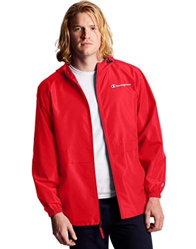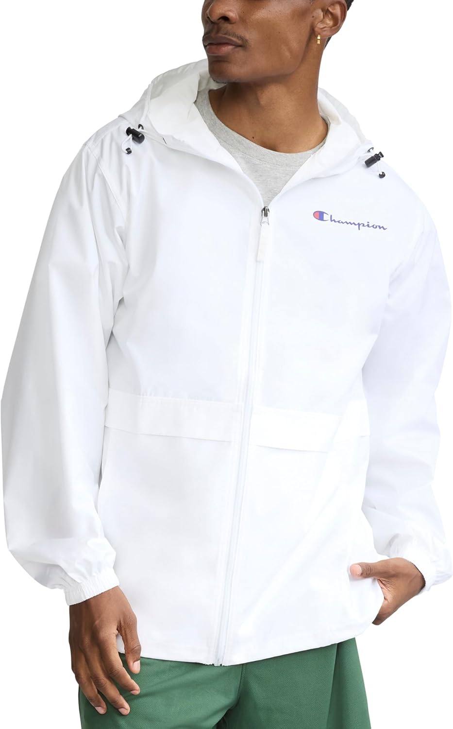 {"about_product": ["THE FIT - This men's jacket has a relaxed fit that's perfect for layering.", "THE FEEL - Slick, wind and water-resistant coating shields you from the elements.", "THE LOOK - Full-zip jacket for men features a scuba-style bungee cord hood, elastic cuffs, and an open bottom hem with a bungee cord featuring a front pocket to keep essentials close.", "SPOT THE C - Iconic script logo at the left chest for recognizable style.", "Note: C logo patch color may vary from image."], "product_description": "This lightweight men's rain jacket, resistant to both wind and water, is your ideal companion for outdoor adventures. It's equipped with a full-zip front, a scuba-style collar, and a hood secured by a bungee cord. The jacket's roomy design allows for easy layering, even over your favorite Champion sweatshirt. It boasts smart features like rain flaps at the front and back, elastic cuffs to keep out wind and rain, and an adjustable bungee cord hem for a custom fit. It also has front pockets for essentials and a recognizable Champion script logo on the left chest.", "product_information": {"ASIN": "B0FZCXF1RD", "Department": "mens", "Manufacturer": "Champion", "Customer Reviews": "4.4 4.4 out of 5 stars \n\n (4,221)", "Best Sellers Rank": "#18,861 in Clothing, Shoes & Jewelry (See Top 100 in Clothing, Shoes & Jewelry) #4 in Men's Track Jackets", "Item model number": "V1015", "Date First Available": "November 3, 2025"}, "product_details": {"Origin": "Imported", "Fabric type": "100% Polyester", "Fur description": "No Fur", "Care instructions": "Machine Wash"}}