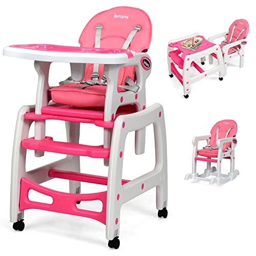 {"about_product": ["5-In -1 Convertible Baby Highchair: INFANS highchair for babies and toddlers has a multi-function design that it is not only a highchair, but also can be converted into a rocking chair or table and chair set. And the construction is also very simple to convert it into other forms. The table can be used as sturdy desk or dining table and the chair can be used as a dining chair, a rocking chair or toddler seat. Such high-usage frame makes it available for ages from 6 months to 8 years.", "Adjustable Seat Back & Trays: Our silla de comer para bebe has a user-friendly design that the seat back is adjustable with 3 positions. The 3 lever positions are ideal for baby eating, feeding and relaxing. The distances between the trays to the seat back are also adjustable with 9’’ to 12’’ to meet different needs. With such scientific structure, our infant baby highchair can make babies to use more comfortable.", "Detachable Double Trays: Considering the variable use needs, our baby highchairs has a two layers tray. The trays are also detachable, the harmless PP materials also make them easy to clean and maintain. The top tray can be used for eating which have special grooves design and can be used as cup holder and cutlery holder. The bottom tray can be used for playing. And you can also remove the trays to use it as a toddler chair.", "Stable Frame With Universal Wheels: Babies like to wiggle their bodies which require the highchair to be stable enough. Our toddler chair has scientific structural design to ensure long time durable use. We use high-quality PE materials for the main construction and there are extra reinforced connections to provide stability. Our high chairs for babies includes 4 universal wheels for easily move and the wheels are also fixable to meet different use needs.", "High-Quality & Harmless Materials: We use eco-friendly and harmless PE and PP materials as our main construction which ensure it durable and strong enough for long time daily use. And the surface of our baby high chair is smooth for easily clean and maintain. 5-point safety harness ensures security for your little baby. All the corners of our baby highchair are smooth without sharp edges to avoid extra crush injury.", "US. CPSIA & ASTM APPROVED: Made of food-grade PP, FREE from BPA, PVC, Phthalates, Lead, Latex, and Formaldehyde. No sharp points or edges. Passed the tests of stability, asphyxiation,load, and shear."], "product_description": null, "product_information": {"ASIN": "B07TZ2K7HL", "Style": "Rocking Chair Function", "Is portable": "No", "Item Weight": "17 pounds", "Material Type": "PP, PE, Sponge,Polyester", "Best Sellers Rank": "#11,153 in Baby (See Top 100 in Baby) #94 in Baby Highchairs", "Item model number": "BB5604", "Batteries required": "No", "Product Dimensions": "20 x 23 x 40.5 inches", "Material Composition": "PP, PE, Sponge", "Maximum weight recommendation": "50 Pounds"}, "product_details": {"Brand": "INFANS", "Color": "Pink", "Material": "PP, PE, Sponge,Polyester", "Item Weight": "17 Pounds", "Product Dimensions": "20"D x 23"W x 40.5"H"}}