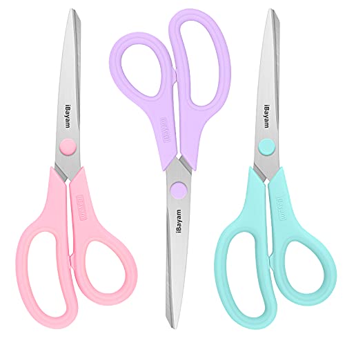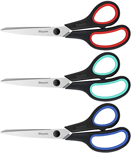 {"about_product": ["3 Pairs of Quality All Purpose Scissors -- 2.5mm Thickness Sharp Blade, comfort-Grip Handle, Heavy Duty Scissors Great for cutting burlap, paper, card stock, cardboard, wrapping paper, light line, fabric, tape, photos, coupons, and opening boxes & packaging. Surprised for sewing, tailoring, quilting, dressmaking, cutting patterns, cutting quilting, Vinyl, Leather, and making face masks.", "2.5MM Thickness Precise Smooth Cutting Heavy Duty Scissors -- They strongly allow you to make precise cuts with great control as the blade has the perfect amount of friction, which is very comfortable to use. 3 pairs of straight handled scissors for smooth, efficient cutting scissors for general use. Suitable for teachers' middle/high school classroom supplies.", "Sharp Office Scissors -- Stainless steel blades enable high-density steel that makes it 3 times harder than normal stainless steel and is smoother cutting. 6 X longer lasting than the previous formula and remain sharp for 100,000 + cuts. Blades stay sharper longer; We chose bright colors, Black Green/Black Red/Black Blue. Different color rubber handles are used in different places, comfort-Grip holes let you maintain a comfortable, can be used left- or right-handed.", "iBayam 8-Inch comfort-Grip Scissors for Left and Right Hand -- 3 Special scissors are suitable for most items that need to be cut. It can also be used as a household scissors for cutting open frozen food bags ready for cooking. Convenient, sturdy, especially sharp scissors.", "Exclusive Scissors for Multiple Uses in Various Rooms-- in the Handcraft Workshop, bathroom, sewing room, laundry room, craft room, at the office, great for most regular household tasks."], "product_description": null, "product_information": {"ASIN": "B07YDDX4JL", "Size": "3-Pack", "Brand": "iBayam", "Color": "Red, Green, Blue", "Style": "Classic", "Material": "Stainless Steel,Rubber,Steel", "Blade Edge": "Straight", "Unit Count": "3 Count", "Item Weight": "3.2 ounces", "Part Number": "662968", "Point Style": "Pointed", "Manufacturer": "iBayam", "Blade Material": "Stainless Steel", "Handle Material": "Rubber", "Number of Items": "3", "Hand Orientation": "Ambidextrous", "Best Sellers Rank": "#14 in Arts, Crafts & Sewing (See Top 100 in Arts, Crafts & Sewing) #1 in Craft Scissors #1 in Office Cutting Tools", "Item model number": "3 Scissors", "Product Dimensions": "8.4\"L x 3\"W", "Batteries Required?": "No", "Date First Available": "September 26, 2019", "Item Package Quantity": "1"}, "product_details": {"Brand": "iBayam", "Color": "Red, Green, Blue", "Material": "Stainless Steel,Rubber,Steel", "Blade Material": "Stainless Steel", "Product Dimensions": "8.4"L x 3"W"}}
