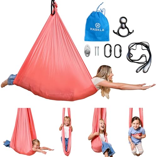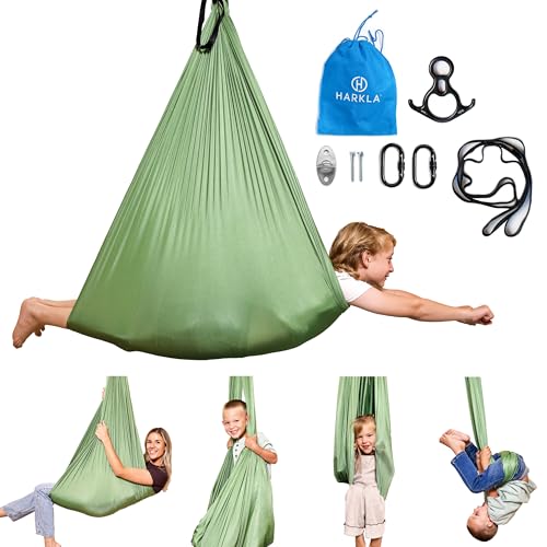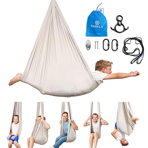 {"about_product": ["HUG-LIKE CALMING EFFECT: The compression sensory swings has a hug-like effect and helps kids and adults feel secure. The double-layered washable nylon swing cloth is soft, comfy, and does not sag. Sensory seekers can use it indoors.", "100% LIFETIME GUARANTEE: Safe for use by Kids and Adults. The indoor swing is US CPSC Certified and has a lifetime, money-back guarantee. If you do not love your Harkla kids hammock, we will give you a replacement.", "EASY HANG EASY USE - The swing indoor is sturdy and holds up to 300 lbs. It comes with heavy-duty hardware, detailed step-by-step easy assembly instructions, and a product course. Get started with fun and therapeutic activities.", "GOODBYE MELTDOWNS: The sensory swing is designed to help sensory seekers regulate their emotions. The swinging motion paired with compression provides the perfect vestibular sensory input, calming, and grounding for the nervous system.", "INDOOR HANGOUT: Harkla’s indoor swing for kids will be your kiddo's new go-to place to relax and calm down. The room swing is excellent for fun and sensory input and helps spark functional communication.", "2-WAY STRETCH SWING - Our swing fabric is made of low 2-way stretch nylon, offering minimal to no stretch lengthwise. This ensures stability when climbing in or sitting, while stretching widthwise to accommodate users of various heights. Unlike other swings, it doesn’t sag to the ground, making it unique and preferable for many.", "LIGHT AND STRONG FABRIC -The fabric is semi-translucent, thinner, and designed to let light in, allowing users to see through the swing. Despite its thinness, it is highly durable, strong, soft, and easy to clean, with a high breaking point."], "product_description": null, "product_information": {"UPC": "850004147290", "ASIN": "B07Z79ZCZX", "Brand": "Harkla", "Color": "Blue", "Seat Depth": "64 inches", "Finish Type": "Smooth", "Item Weight": "3.97 pounds", "Manufacturer": "Harkla", "Frame Material": "Aluminum", "Assembly Required": "Yes", "Best Sellers Rank": "#363 in Patio, Lawn & Garden (See Top 100 in Patio, Lawn & Garden) #4 in Swing Chairs", "Item model number": "Sensory Swing", "Product Dimensions": "13.11\"D x 3.43\"W x 9.57\"H", "Date First Available": "January 7, 2020"}, "product_details": {"Brand": "Harkla", "Color": "Blue", "Material": "Aluminum", "Item Weight": "3.97 Pounds", "Product Dimensions": "13.11"D x 3.43"W x 9.57"H"}}