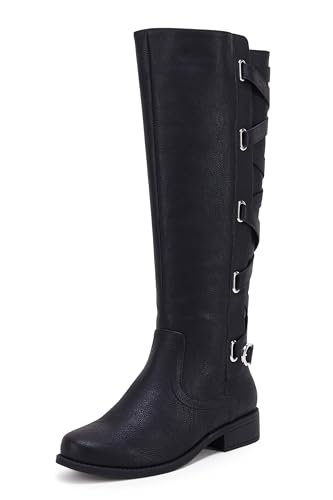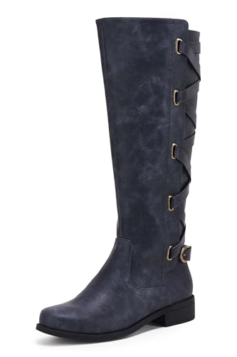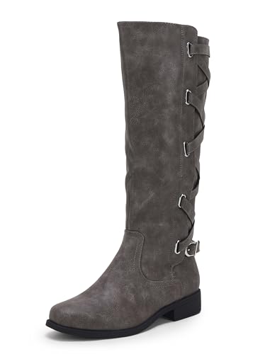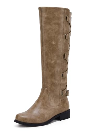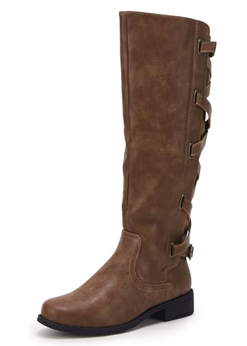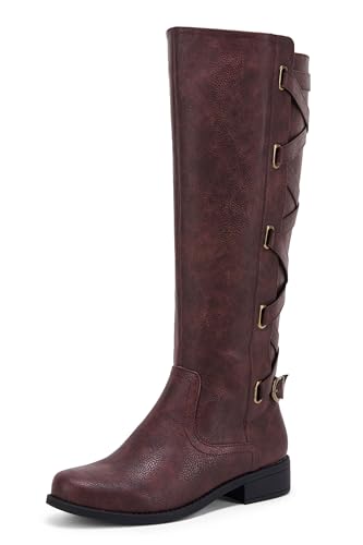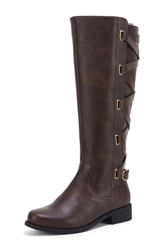 {"about_product": ["Fashionable brown knee high riding boots for women", "Back strappy design with side zipper and buckle details", "Low chunky heel and closed round toe style", "Perfect for casual wear, work, shopping, date, outdoor", "Rubber sole and soft interior lining for comfort"], "product_description": "Product Description: Upgrade your winter footwear collection with these Women' stsappy motorcycle knee high boots. These boots are designed to keep you stylish and comfortable during the colder months. The lace-up design and strappy details add a trendy and edgy touch to your outfits. The flat low heel provides stability and support, making these boots perfect for all-day wear. Whether you're riding a motorcycle or simply running errands, these boots are a must-have addition to your wardrobe.", "product_information": {"ASIN": "B086D4S79V", "Department": "womens", "Customer Reviews": "4.2 4.2 out of 5 stars \n\n (2,995)", "Product Warranty": "For warranty information about this product, please click here", "Best Sellers Rank": "#40,667 in Clothing, Shoes & Jewelry (See Top 100 in Clothing, Shoes & Jewelry) #159 in Women's Knee-High Boots", "Date First Available": "March 25, 2020"}, "product_details": {"Sole material": "Rubber", "Inner material": "Polyester", "Outer material": "Leather", "Shaft circumference": "14.5 inches"}}