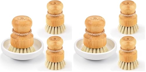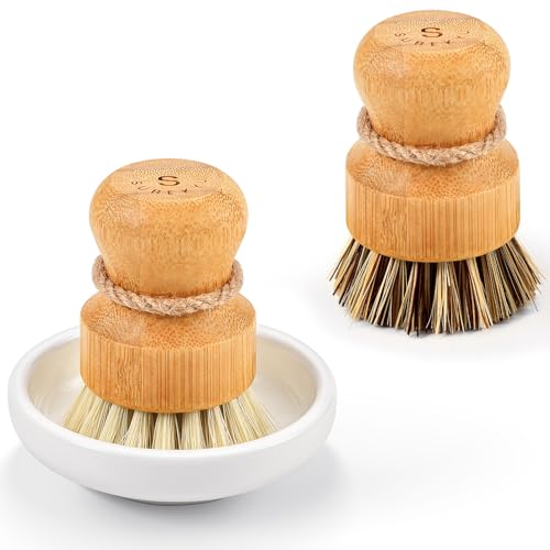 {"about_product": ["Easy to brush off stain: High-density firm bristles make it easy to brush off stains on a variety of surfaces without wearing and scratching", "Cleaning dishes & pans: Perfect for washing the dishes, cast iron pans, and other stubborn stains", "Wide applications: Suitable for washing vegetables & fruits, chopping boards, crevices, kitchen sink and more", "Natural material: Selected by natural bamboo and Sisal which is compostable. Bamboo handle and Sisal Bristles", "Keep dry after Use: Bamboo is plant, like wood, so do not soak it in the water for a long time. Please hang it for air drying"], "product_description": null, "product_information": {"UPC": "778695076814", "ASIN": "B082XRB79L", "Brand": "SUBEKYU", "Color": "Mini White", "Shape": "Round", "Material": "Bamboo", "Unit Count": "3.0 Count", "Item Weight": "3.2 ounces", "Manufacturer": "SUBEKYU", "Handle Material": "Bamboo", "Number of Items": "3", "Special Feature": "Soap Dispenser", "Assembly required": "No", "Best Sellers Rank": "#7,922 in Health & Household (See Top 100 in Health & Household) #53 in Household Cleaning Brushes", "Item model number": "EA2106", "Batteries required": "No", "Product Dimensions": "5.8\"L x 3.5\"W x 3.9\"H", "Included Components": "Scrub Brushes,Ceramic Dish", "Surface Recommendation": "Sink", "Item Firmness Description": "Hard"}, "product_details": {"Brand": "SUBEKYU", "Color": "Mini White", "Material": "Bamboo", "Handle Material": "Bamboo", "Product Dimensions": "5.8"L x 3.5"W x 3.9"H"}}
