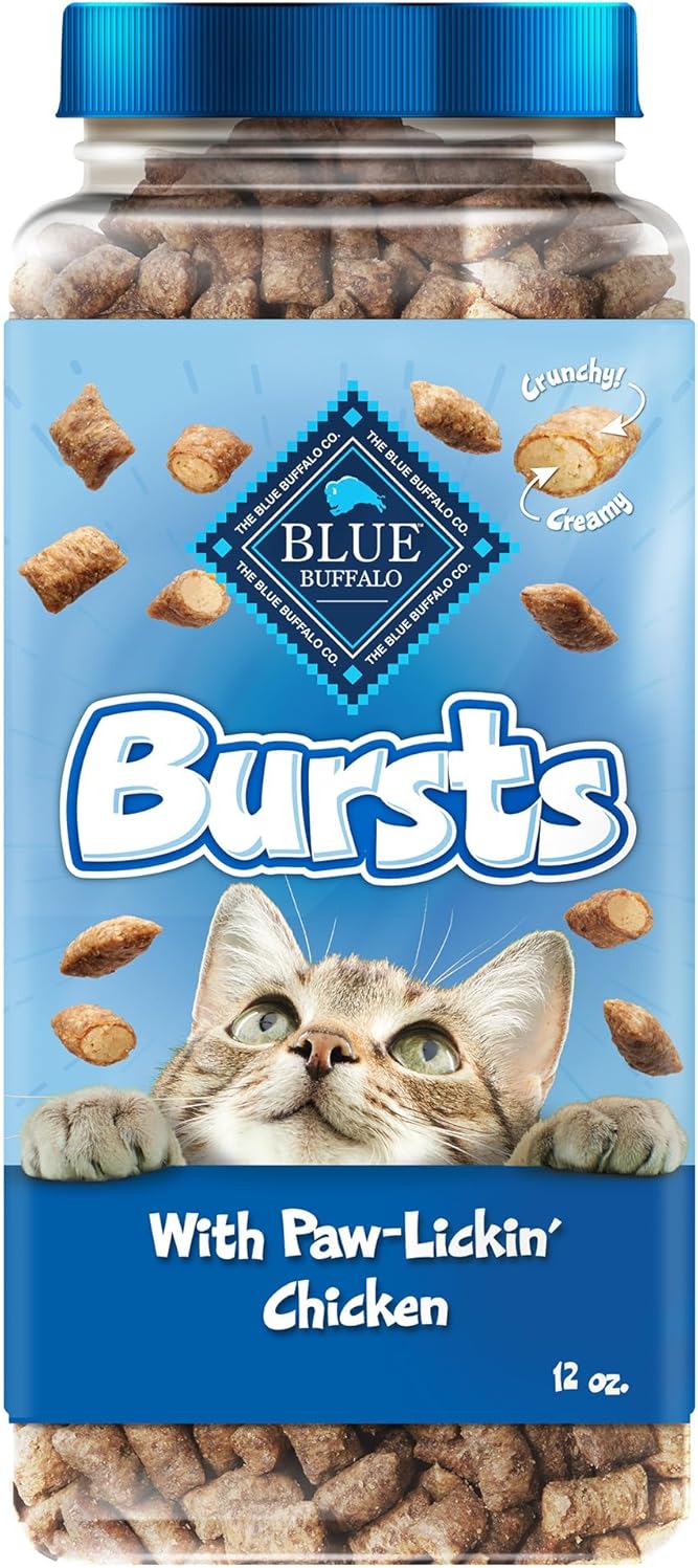 {"about_product": ["REAL MEAT FIRST: These Blue Buffalo cat treats are made with real chicken as the first ingredient for a taste cat loves", "TWO TEMPTING TEXTURES: BLUE Bursts cat treats have a crunchy outside and creamy inside that make them oh-so-dreamy", "BURSTING with FLAVOR: Tempt any feline friend with these crunchy and soft cat treats", "HEALTHY, WHOLESOME INGREDIENTS: These healthy cat treats contain no chicken (or poultry) by-product meals, and they are free from corn, wheat, and soy", "Contains One (1) 12-oz tub of BLUE Bursts Crunchy & Creamy Cat Treats with Paw-Lickin' Chicken", "ENHANCED IMAGERY: We have enhanced our digital product packaging to highlight our products’ ingredients and essential benefits; while the physical packaging will differ slightly, all information is accurate"], "product_description": "Reward your cat with the savory taste of real chicken with BLUE Bursts Cat Treats, made with real chicken as the first ingredient. These crunchy cat treats have a hard exterior and burst with flavor in the creamy interior, satisfying your cat's cravings for delicious snacks. With a protein-rich formula, BLUE Bursts offers crunchy, tasty bites of chicken packed with wholesome ingredients that cats will go wild for. And like all Blue Buffalo recipes, these cat treats are made with nutritious ingredients, including real meat, and contain no chicken (or poultry) by-product meals, corn, wheat, soy, artificial flavors, or preservatives.", "product_information": {"ASIN": "B083256F9B", "Size": "1 Count (Pack of 1)", "Brand Name": "Blue Buffalo", "Directions": "While your furry friend would probably love to eat the whole bag, BLUE Bursts are intended for intermittent or supplemental feeding only.", "Model Name": "BLUE", "Item Weight": "14.4 ounces", "Manufacturer": "Blue Buffalo Company, Ltd", "Number of Items": "1", "Care Instructions": "Store in cool, dry place", "Item model number": "803039", "Included Components": "12-oz tub", "Breed Recommendation": "All Breed Sizes", "Date First Available": "February 4, 2020", "Age Range Description": "All Life Stages", "Item Dimensions LxWxH": "6.7 x 3.01 x 3.01 inches", "Target Audience Keyword": "cats, dogs, house-cats", "Specific Uses for Product": "Behavior", "Item Package Dimensions L x W x H": "6.69 x 2.95 x 2.91 inches"}, "product_details": {"Brand": "Blue Buffalo", "Flavor": "Chicken", "Item Form": "Semi Moist", "Age Range (Description)": "All Life Stages", "Specific Uses For Product": "Behavior"}}