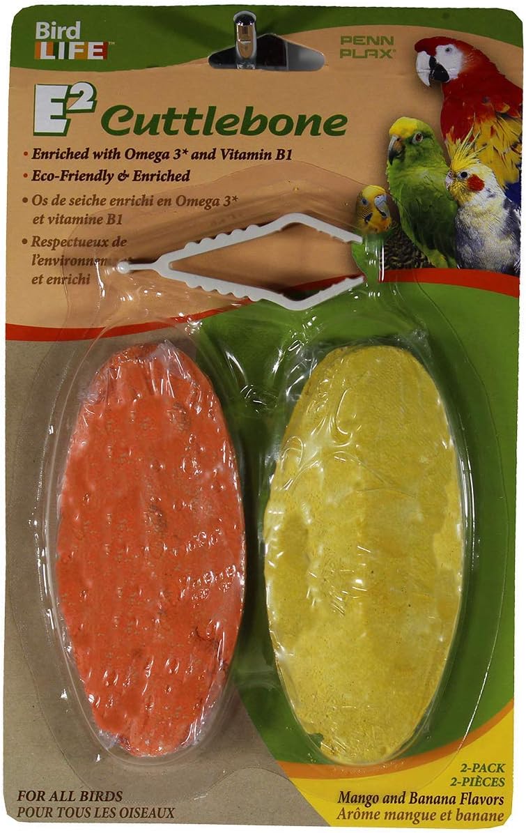 {"about_product": ["BENEFICIALLY FLAVORED: Change things up for your pet with our flavored E2 Cuttlebone 2 Pack! This combo pack contains 2 flavored cuttlebones: 1 Mango and 1 Banana. Along with providing additional vitamins and minerals, our flavored E2 Cuttlebones allows for subtle and stimulating change in your pet’s daily life.", "ENRICHED WITH VITAMINS & MINERALS: Our E2 Cuttlebones are enriched with Omega 3 Fatty Acids, Honey, and Vitamin B. All of these nutrients are necessary for maintaining healthy bones and plumage (feathers), as well as avian energy needs and egg production.", "DURABLE & LESS BRITTLE: Our E2 Cuttlebones are made to be less brittle compared to the competition, and are free from artificial ingredients or colorings. Furthermore, to help prevent Cuttlefish population from becoming decimated, this product is made with 40% cuttlebone.", "CLIP INCLUDED: To make for simple and easy mounting, our E2 Cuttlebones include a clip for hanging on a wire cage.", "SHOP PENN-PLAX FOR ALL YOUR PET’S NEEDS: Penn-Plax is a manufacturer and distributor of top quality pet supplies, who specialize in creating excellent pet products for animals, both great and small."], "product_description": "Bird Life presents the Flavored E2 Cuttlebone 2 Pack with Mango and Banana by Penn-Plax.\n Change things up for your pet with our flavored E2 Cuttlebone 2 Pack!\n This combo pack contains 2 flavored cuttlebones: 1 Mango and 1 Banana.\n Along with providing additional vitamins and minerals, our flavored E2 Cuttlebones allows for subtle and stimulating change in your pet’s daily life.Enriched with Vitamins & Minerals:\n Our E2 Cuttlebones are enriched with Omega 3 Fatty Acids, Honey, and Vitamin B.\n All of these nutrients are necessary for maintaining healthy bones and plumage (feathers),\n as well as avian energy needs and egg production.Durable & Less Brittle:\n Our E2 Cuttlebones are made to be less brittle compared to the competition,\n and are free from artificial ingredients or colorings.\n Furthermore, to help prevent Cuttlefish population from becoming decimated, this product is made with 40% cuttlebone.Clip Included:\n To make for simple and easy mounting, our E2 Cuttlebones include a clip for hanging on a wire cage.Shop Penn-Plax for All Your Pet’s Needs:\n who specialize in creating excellent pet products for animals, both great and small.", "product_information": {"ASIN": "B083C212TM", "Size": "2 pack", "Color": "Multicolor", "Brand Name": "Penn-Plax", "Directions": "Remove from packaging.", "Model Name": "BA656N", "Item Weight": "0.1 Ounces", "Manufacturer": "Penn-Plax", "Number of Items": "11", "Item model number": "BA656N", "Breed Recommendation": "All Breed Sizes", "Date First Available": "December 31, 2019", "Age Range Description": "All Life Stages", "Item Dimensions LxWxH": "2 x 0.5 x 4.5 inches", "Target Audience Keyword": "birds", "Specific Uses for Product": "Training", "Item Package Dimensions L x W x H": "9.02 x 6.93 x 0.67 inches"}, "product_details": {"Brand": "Penn-Plax", "Flavor": "Flavored", "Item Form": "Cuttlebone", "Age Range (Description)": "All Life Stages", "Specific Uses For Product": "Training"}}
