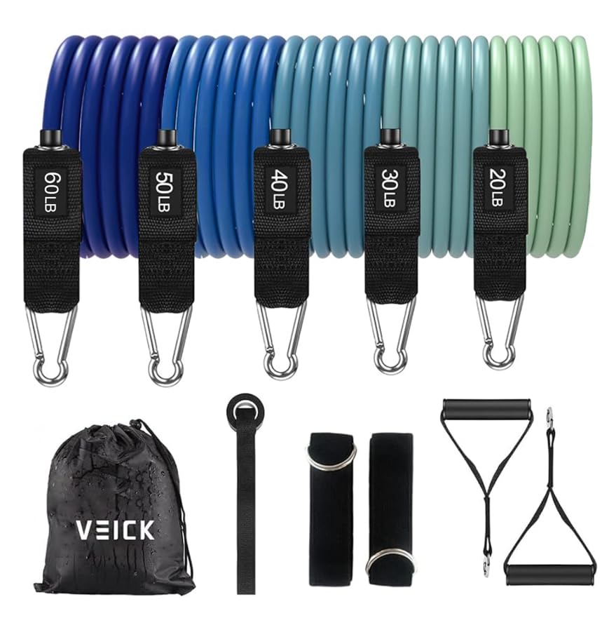 {"about_product": ["Natural Latex", "Imported", "Adjustable Resistance Bands - Maximum equivalent of 150 lbs, come as a set of 5, 48-inch long colored exercise bands: Yellow(10 lbs), Blue(20 lbs), Green(30 lbs), Black(40 lbs), Red(50 lbs). You can use the bands independently or in any combination with a maximum resistance level of 150 lbs", "Multifunctional for Workout - VEICK resistance band set is great with any workout like Yoga, Pilates and Fitness. Or use them for general exercise, stretching, training, weights programs", "Mobile Gym to Build Muscles - You can use the resistance bands with ankle straps and door attachment to exercise at home or outside. You can do exercise anytime and anywhere to burn fat and improve balance, mobility, gait function", "Portable & Easy to Store - These bands are so lightweight and this resistance kit comes with a cloth pouch. It is very convenient to carry and store", "What Are Included - 5 Tube Resistance Bands, 2 Soft Cushioned Handles, 2 Ankle Straps, 1 Door Anchor, 1 Exercise Guidance, 1 Carrying Bag"], "product_description": null, "product_information": {"ASIN": "B086X4PN48", "Size": "10-150LBS", "Brand": "VEICK", "Color": "Colorful", "Sport": "Exercise and Fitness", "Style": "10-150LBS", "Material": "Natural Rubber", "Brand Name": "VEICK", "Item Weight": "0.91 Hundredths Pounds", "Part Number": "HDS-EB01", "Manufacturer": "VEICK", "Tension Level": "10-150LBS", "Item Thickness": "2.2 Millimeters", "Package Weight": "0.64 Kilograms", "Special Feature": "Adjustable, Lightweight, Stackable", "Suggested Users": "unisex-adult", "Best Sellers Rank": "#517 in Sports & Outdoors (See Top 100 in Sports & Outdoors) #9 in Resistance Bands", "Product Dimensions": "48\"L x 0.8\"W", "Included Components": "5 Tube Resistance Bands, 2 Soft Cushioned Handles, 2 Ankle Straps, 1 Door Anchor, 1 Exercise Guidance, 1 Carrying Bag", "Date First Available": "April 9, 2020", "Warranty Description": "1 Year Manufacturer", "Item Dimensions LxWxH": "6.69 x 4.33 x 7.87 inches", "Number of Resistance Levels": "6", "Recommended Uses For Product": "Home, Workout", "Item Package Dimensions L x W x H": "12.4 x 8.43 x 4.41 inches"}, "product_details": {"Brand": "VEICK", "Color": "Colorful", "Sport": "Exercise and Fitness", "Material": "Natural Rubber", "Item Weight": "0.91 Hundredths Pounds"}}