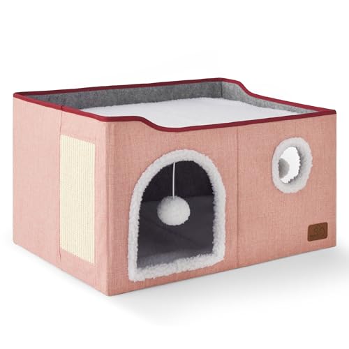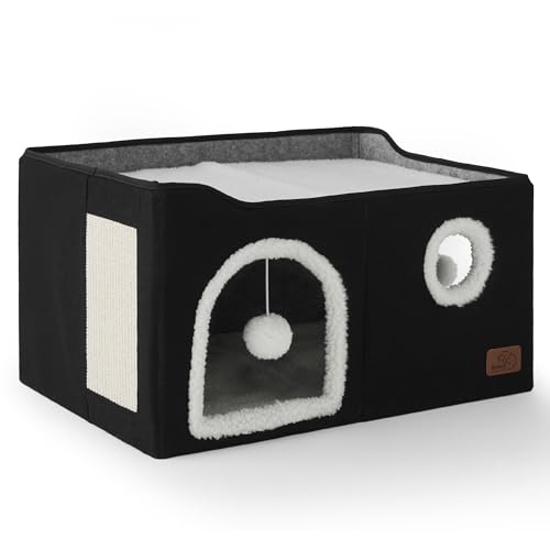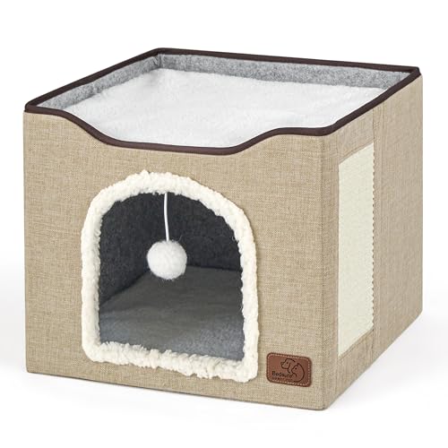 {"about_product": ["Private & Cozy: The enclosed bottom area provides a hidden space for cats, small dogs, and rabbits to sleep in, while the upper platform can be used as an all-purpose nap pad to look out the window, lounge, and unwind. Great for multi-cat households.", "Spacious Comfort: The cat hideout's bottom compartment measures 16.5 x 16.5 x 13\", ensuring a spacious yet cozy den for cats of all ages. The top platform is larger than most brands, providing plenty of room for your cat to stretch out and get cozy.", "Pet Safe Design: Cat hideaway made from pet-friendly MDF materials with CARB Certification and soft lambswool fabric. This large cat house is equipped with a durable sisal scratching board and plush hanging ball to keep your cat engaged and happy.", "Sturdy & Stylish: Constructed with sturdy and lightweight MDF boards for added durability. The classic style works anywhere in the home, from the living room to your bedroom, an office, the garage, or wherever your pet needs a cozy cat cave. Surroundings of the cat houses & condos and the top cushion is made of lightweight and sturdy MDF boards. Cats under 20 Lbs can jump and play freely.", "Easy Care & Assembly: This cat cube for indoor cats can be quickly assembled or folded flat for easy storage and travel. Portable and lightweight. The removable cushions feature reversible, machine-washable covers that provide all-season comfort."], "product_description": null, "product_information": {"ASIN": "B08CY5VR5W", "Size": "Single", "Color": "Grey", "Style": "Modern", "Material": "pet-friendly MDF materials with CARB Certification and soft lambswool fabric", "Brand Name": "Bedsure", "Item Weight": "4.92 Pounds", "Manufacturer": "Bedsure Comfy Pet", "Care Instructions": "Machine Washable", "Breed Recommendation": "All Breed Sizes", "Date First Available": "July 14, 2020", "Age Range Description": "All Life Stages", "Item Dimensions LxWxH": "16.5 x 16.5 x 14 inches", "Target Audience Keyword": "house-cats, small-animal-pets", "Specific Uses for Product": "Indoor", "Item Package Dimensions L x W x H": "16.97 x 13.5 x 4.16 inches"}, "product_details": {"Brand": "Bedsure", "Color": "Grey", "Style": "Modern", "Material": "pet-friendly MDF materials with CARB Certification and soft lambswool fabric", "Product Dimensions": "16.5"D x 16.5"W x 13"H"}}