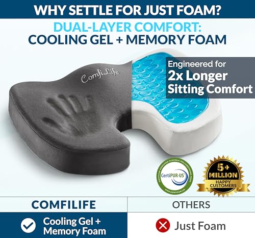 {"about_product": ["Most Comfortable Gel Memory Foam Cushion On The Market - ComfiLife's all-in-one features are unrivaled: Non-slip bottom stays in place, built-in handle for easy transport and machine-washable zippered velour cover for easy cleaning. The ComfiLife Coccyx Cushion is the best gel memory foam seat cushion on the market made of premium quality durable memory foam with cool off gel layer on top for superior comfort", "Ergonomic U-Shaped Design Supports Tailbone and Posture: Recommended by doctors and orthopedic specialists, the ergonomic U-shape promotes healthy spine alignment and provides lower back and sciatica pain relief. Say goodbye to discomfort with this premium coccyx cushion for tailbone pain and back pain relief. Supports recovery from lower back problems, herniated discs, tailbone injuries, sciatica and other spinal issues.", "Great for Any Chair – Versatile use in Office, Car, Travel, Gaming, Wheelchair: Whether you need a car seat cushion, seat cushions for office chairs, airplane travel cushion, sciatica pain relief pillow, wheelchair cushion, or chair pad, this portable cushion is perfect for all seating types. Compatible with driver seats, truck seats, gaming chairs, and more.", "Our Customers Love ComfiLife Cushion - \"I have already recommended this to all my office mates that sit all day, as well. I love it, and some advice...Lock it up after you use it, or I guarantee one of your sneaky cube mates will swipe it!\" \"This has saved my life as one with lower back pain due to pinched nerve roots\" \"I have herniated discs and sciatica for many years, this cushion allowed me to drive cross state with little to no pain\"", "Stays in Place + Easy to Clean: The non-slip rubber bottom ensures your cushion won’t slide on slick surfaces. Comes with a machine-washable, removable cover for easy cleaning—perfect for daily use in cars, offices, and planes.", "Durable Gel-Enhanced Memory Foam: Our gel seat cushion retains shape even after extended use, providing consistent comfort and cooling. Ideal for long drives, flights, or sitting at a computer—this seat cushion supports your butt, health and productivity. If you are not satisfied get a full refund or replacement, no questions asked."], "product_description": null, "product_information": {"ASIN": "B08HPQVJMW", "Size": "one size", "Brand": "ComfiLife", "Color": "Black", "Shape": "Semicircular", "Pattern": "Solid", "Use for": "Back", "Variety": "Memory Foam,Seat Cushion", "Material": "Memory Foam", "Unit Count": "1 Count", "Fabric Type": "Rubber,velour", "Item Weight": "1.45 pounds", "Manufacturer": "ComfiLife", "Fill Material": "Gel Memory Foam", "Material Type": "Memory Foam", "Special Feature": "Cooling Gel + 100% Premium Memory Foam Cushion", "Number of Pieces": "1", "Best Sellers Rank": "#441 in Office Products (See Top 100 in Office Products) #2 in Wheelchair & Mobility Scooter Cushions #2 in Automotive Seat Cushions #6 in Back Cushions & Seat Cushions", "Item model number": "ComfiLife Gel Enhanced Seat Cushion", "Product Dimensions": "17.5\"L x 13.7\"W", "Date First Available": "November 18, 2020", "Age Range (Description)": "Adult", "Manufacturer Part Number": "CLGSCBLK", "Item Firmness Description": "Soft", "Product Care Instructions": "Machine Wash", "Specific Uses For Product": "car seat, drive, home, office, business, office chair, travel", "Recommended Uses For Product": "Office, Car, Home", "Global Trade Identification Number": "00850023513014"}, "product_details": {"Size": "one size", "Brand": "ComfiLife", "Color": "Black", "Fill Material": "Gel Memory Foam", "Special Feature": "Cooling Gel + 100% Premium Memory Foam Cushion"}}