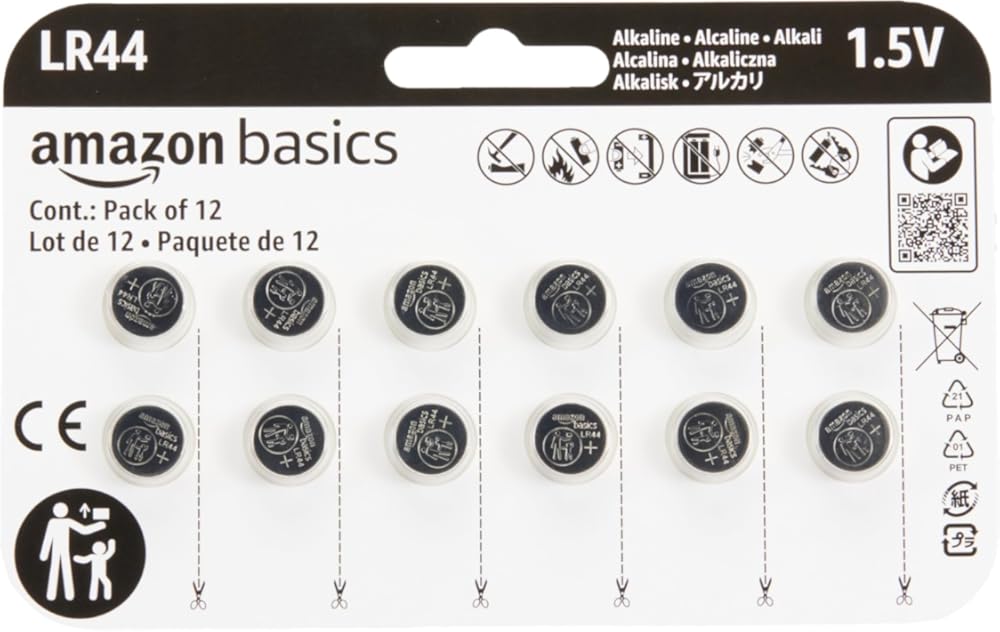 {"about_product": ["IN THE BOX: 12-pack of LR44 1.5-volt alkaline button coin cell replacement batteries for small electronic devices", "DEVICE COMPATIBLE: Ideal for watches, calculators, toys, and more", "LONG LASTING: Long-lasting, reliable battery life; performs in extreme temperatures", "EASY USE & STORAGE: Easy to open and store extras for later; ships in child resistant packaging; contains zero mercury", "EASY IDENTIFICATION: Engraved with battery model for quick identification", "EQUIVALENT TO 76A, A76, GP76A, PX76A, PX76, CR44, SR44, SR44W, SR44SW, S357, 357, AG13, G13, V13GA, V136A, 675, 1166a, LR44H, RW82B, EPX76, 303, S303, SP303, and L1154 battery types"], "product_description": "Product Description Amazon Basics 12 Pack LR44 1.5 Volt Alkaline Button Cell Battery, Long Lasting Power in Child Resistant Packaging From the Manufacturer Amazon Basics", "product_information": {"ASIN": "B08J4S2HGS", "Batteries": "12 LR44 batteries required.", "Manufacturer": "Amazon", "Customer Reviews": "4.7 4.7 out of 5 stars \n\n (74,277)", "Best Sellers Rank": "#81 in Health & Household (See Top 100 in Health & Household) #2 in Coin & Button Cell Batteries", "Item model number": "LR44-12pk", "Product Dimensions": "0.46 x 0.46 x 0.21 inches; 0.06 ounces", "Date First Available": "April 20, 2021"}, "product_details": {"Brand": "Amazon Basics", "Battery Capacity": "1.5", "Number of Batteries": "12 LR44 batteries required.", "Battery Cell Composition": "Alkaline", "Recommended Uses For Product": "Calculators,Watches"}}