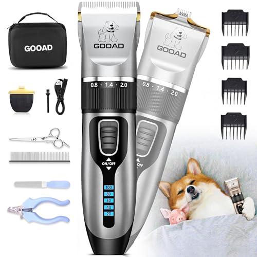 {"about_product": ["【2 Blade in 1 Set】Wide Blade for thick coats. Narrow Blade for hair around paws, rump, face, ear, beard and mustache. ALL-IN -ONE,We Have All The Tools Needed For Pet Grooming.", "【Long Lasting Battery & LCD display】2200mA High Capacity Li-ion Battery, charging for 3 hours and can sustain use of 250 minutes.for reminding using and charging. Rechargeable design of this dog clipper, you don't have to buy replace batteries.", "【Safe and Sharp Blade】High quality 33-tooth titanium blade and ceramic movable blade cooperate to provide excellent cutting performance, while surpassing the standard 24 or 26-tooth blades including most pet clippers. It always keeps sharp and ensures high durability. Detachable blades, easy to change and clean.", "【Low Noise & Strong Power 】Q-SUS Low-Noise-Tech lowers the noise less than 60db. Adopt silver Pd-alloy 3 speed motor, heavy-duty and durable. 5 Size Fine Tuning Knob,Dog clipper has 0.8mm-2.0mm Fine Tuning Knob, which allow you to adjust different hair lengths for versatility. This High Performance dog grooming kit help you get the suitable length for the pet coat.", "【Take Your Pet on a Long Journey】Multifunctional tool kit, easily store and protect your clipping tools. It is also convenient for you to bring the haircut kits to travel. GOOAD will always help you whenever."], "product_description": null, "product_information": {"ASIN": "B08L6NZQMH", "Batteries": "1 Lithium Ion batteries required. (included)", "Manufacturer": "Gooad", "Customer Reviews": "4.5 4.5 out of 5 stars \n\n (6,168)", "Best Sellers Rank": "#10,929 in Pet Supplies (See Top 100 in Pet Supplies) #42 in Dog Grooming Clippers", "Item model number": "KIT001", "Product Dimensions": "2.87 x 5.94 x 8.43 inches; 1.43 Pounds", "Date First Available": "October 14, 2020"}, "product_details": {"Brand": "Gooad", "Color": "Gold", "Item Weight": "650 Grams", "Power Source": "Battery Powered", "Recommended Uses For Product": "Beard, Ear, Face, Mustache"}}