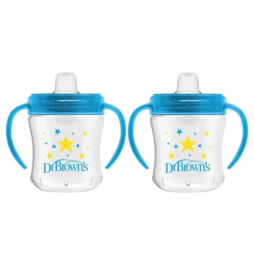 {"about_product": ["A soft approach leads to big leaps in the bottle to cup transitions with the Dr. Brown's Soft Spout Transition Cup!", "Soft silicone spout feels familiar and offers spill-proof learning. Sturdy handles and contoured shape for good grip with little hands.", "Lid folds all the way back to stay out of baby's way, and keeps spout clean when not in use.", "Bright blue and pink colors with cute rainbow and star patterns keep baby coming back for more.", "One-piece valve for quick assembly and easy cleaning. Dishwasher safe (top rack) and BPA free. 6 oz/180 ml, 6m+.", "Dr. Brown's Transition Sippy Cup with Soft Spout - Blue - 6oz - 6m+"], "product_description": "A soft approach leads to big leaps in the bottle to cup transition with the Dr. Brown's Soft Spout Transition Cup! Help baby get a hold on sippy skills with the soft, one-piece silicone spout for spill-proof learning. With sturdy handles and a contoured shape, baby will get a good grip on this easy-to-handle cup. An updated lid folds all the way back to stay out of baby's way when they drink and keeps the spout clean when not in use. Bright blue and pink colors with cute rainbow and star patterns keep baby coming back for more. This easy-clean cup features a one-piece valve for quick assembly and simple cleaning. Dishwasher safe (top rack) and BPA free. 6 oz/180 ml. 6m+.", "product_information": {"UPC": "072239322239", "ASIN": "B08TT3GHQC", "Size": "6 Ounces", "Brand": "Dr. Brown's", "Color": "Blue Star", "Shape": "Round", "Style": "6 oz, Blue", "Theme": "Baby", "Pattern": "Cup", "Unit Count": "1.0 Count", "Finish Type": "Glossy", "Item Weight": "3.84 ounces", "Reusability": "Reusable", "Manufacturer": "Dr. Brown's", "Embellishment": "Logo", "Material Type": "Plastic, Silicone", "Number of Items": "1", "Special Feature": "Break Resistant, Leak Proof, Lightweight, Spill Proof", "Material Feature": "Insulated", "Best Sellers Rank": "#1,043 in Baby (See Top 100 in Baby) #42 in Toddler Cups", "Item model number": "TC61102-WEB", "Batteries required": "No", "Material Type Free": "BPA Free", "Product Dimensions": "2.7\"W x 4.72\"H", "Included Components": "Dr. Brown's Transition Sippy Cup with Soft Spout - Blue - 6oz - 6m+", "Material Composition": "BPA Free Plastic and Silicone", "Customer Package Type": "Standard Packaging", "Age Range (Description)": "Baby", "Product Care Instructions": "Dishwasher Safe", "Specific Uses For Product": "Cold Drinks, Hot Drinks", "Additional product features": "Break Resistant, Leak Proof, Lightweight, Spill Proof", "Recommended Uses For Product": "Home, Travel", "Standing screen display size": "6 Inches", "Global Trade Identification Number": "00072239322239"}, "product_details": {"Brand": "Dr. Brown's", "Color": "Blue Star", "Capacity": "6 ounces", "Material": "Plastic, Silicone", "Special Feature": "Break Resistant, Leak Proof, Lightweight, Spill Proof"}}