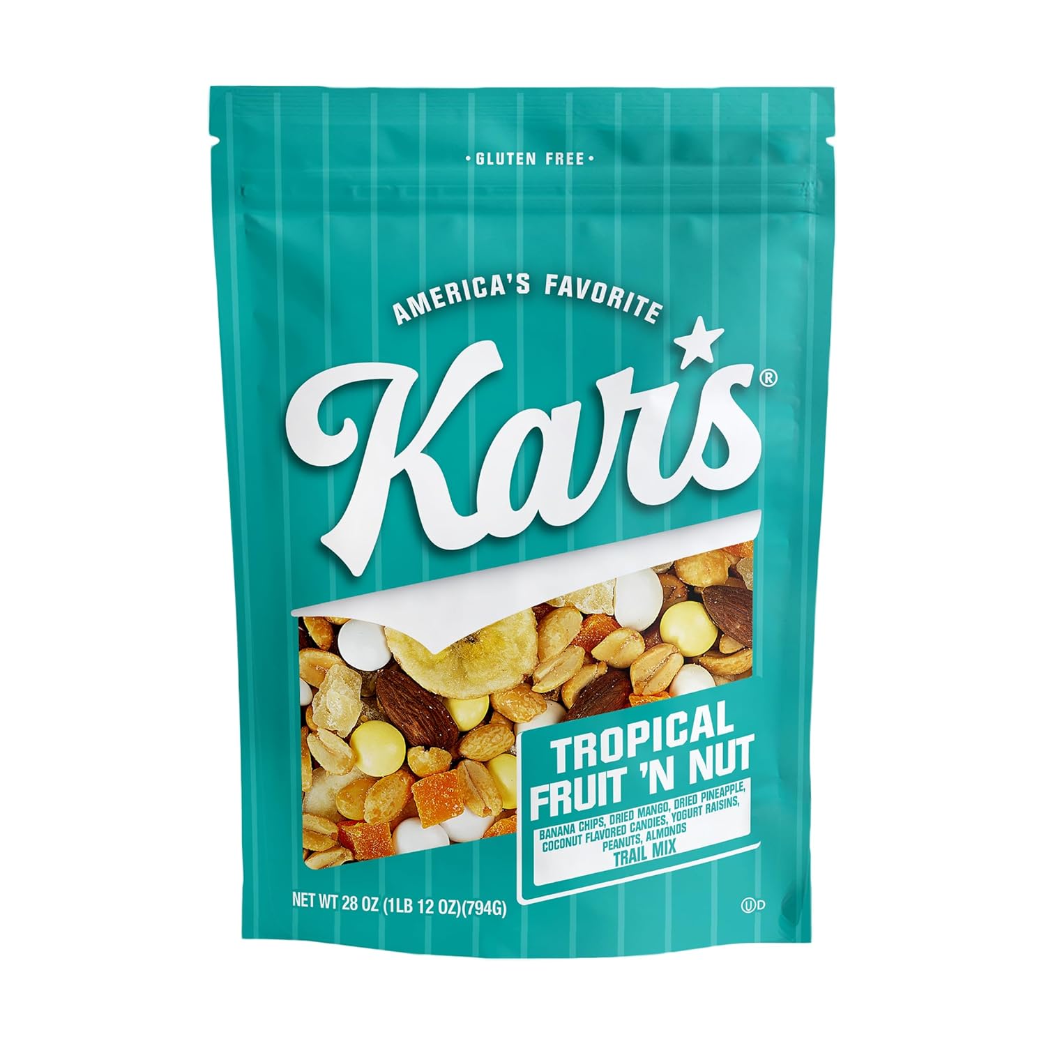 {"about_product": ["TRAIL MIX SNACKS: Satisfy your craving with Kar’s Nuts Tropical Fruit ‘N Nut Trail Mix. Includes (1) 28 oz resealable pouch for ultimate freshness, making it a perfect trail mix for travel, lunchboxes, and on-the-go snacking.", "TROPICAL FRUIT ’N NUT: This trail mix blends banana, mango, pineapple, yogurt raisins, coconut flavored candies, and roasted peanuts and almonds for a sweet, salty, island-inspired snack adventure.", "GLUTEN-FREE GOODNESS: This Kar’s Nuts trail mix is proudly gluten-free, with no hydrogenated oils or trans fats, & is Kosher certified. Enjoy a feel-good snack that is crafted with quality ingredients for you and your family.", "STAYS FRESH, EASY TO ENJOY: This conveniently packaged nut trail mix in bulk leaves you satisfyingly full while delivering indulgent taste. Perfect for offices, road trips, concessions, or anytime you want a high-energy trail mix that keeps you fueled.", "KAR’S NUTS – AMERICA’S FAVORITE: Born in Detroit in 1933, Kar’s Nuts pioneered the Sweet ‘N Salty Mix & remains the MVP of trail mix. We transform the way people snack with blends inspired by universally loved flavor combinations, crafted to satisfy."], "product_description": "Satisfy your hunger with Kar’s Nuts Tropical Fruit ‘N Nut Trail Mix, a delicious gluten-free trail mix snack crafted with quality ingredients you can feel good about. Take your taste buds on a trip with this delicious Kar’s Nuts Trail Mix combination of banana, mango and pineapple, yogurt raisins and coconut flavored candies mixed with roasted and salted peanuts and almonds delivering a perfect Kar’s trail mix experience. Kar’s Nuts, America’s Favorite trail mix brand, has been crafting tasty nut snacks in favorite flavor combinations since 1933. Our convenient 28 oz resealable pouch keeps your snack fresh and ready for travel, offices, kids’ lunches, or on-the-go snacking. Enjoy this Tropical Fruit ‘N Nut trail mix knowing it is free of hydrogenated oils and trans fats, gluten-free, and Kosher certified. Whether you’re seeking a high-energy snack for your busy lifestyle or an indulgent trail mix that delivers on taste, Kar’s Tropical Fruit ‘N Nut Trail Mix is your go-to. Pioneering the Sweet 'N Salty Mix movement, we've led the way in transforming how America snacks — and America agreed.", "product_information": {"UPC": "077034018035", "ASIN": "B08Y1VT3Q5", "Units": "28.0 Ounce", "Manufacturer": "AmazonUs", "Customer Reviews": "4.4 4.4 out of 5 stars \n\n (84)", "Best Sellers Rank": "#35,036 in Grocery & Gourmet Food (See Top 100 in Grocery & Gourmet Food) #84 in Snack & Trail Mixes", "Package Dimensions": "11.06 x 7.76 x 2.83 inches; 1.75 Pounds"}, "product_details": {"Brand": "Kar's", "Flavor": "Tropical Fruit 'N Nut", "Specialty": "Kosher", "Item Weight": "28 Ounces", "Allergen Information": "Peanuts"}}
