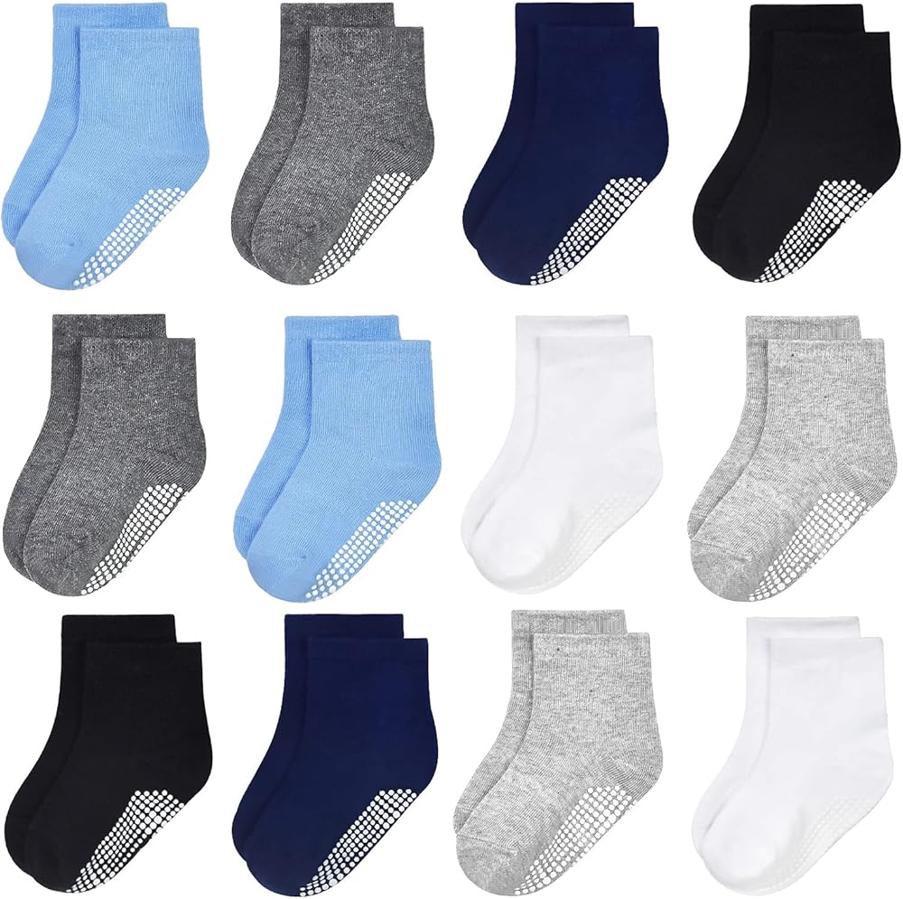 {"about_product": ["Non-Slip Design: Our baby toddler socks feature a special grip bottom to help prevent slips and falls, keeping your little one safe while they explore their world, whether it is for babies to keep warm or toddlers learning to walk, or for children to play at home or in an indoor playground", "Value Pack: This pack includes 12 pairs of non slip toddler socks, providing a variety of colors to mix and match with your baby's outfits, perfect for baby's daily wear. Ensuring you always have a clean pair on hand", "Soft and Comfortable: Made with high-quality cotton blend material, these anti skid baby socks are soft, breathable, and gentle on your baby's delicate skin, providing ultimate comfort throughout the day", "Gift Choice: With a stretchy and flexible design, our baby grip socks fit comfortably on most babies and toddlers 0-5 years old, accommodating growth and movement. Toddler socks would be an ideal birthday/holiday gift for your son or daughter, grandson or granddaughter and your friends' kids", "Easy to Maintain: These baby toddler socks with grip are machine washable and dryer friendly, making them convenient and easy to care for, without compromising on their quality and durability"], "product_description": null, "product_information": {"ASIN": "B08PF3B991", "Department": "baby-boys", "Manufacturer": "GRPSKCOS", "Customer Reviews": "4.8 4.8 out of 5 stars \n\n (1,696)", "Product Warranty": "For warranty information about this product, please click here", "Best Sellers Rank": "#8,005 in Clothing, Shoes & Jewelry (See Top 100 in Clothing, Shoes & Jewelry) #6 in Baby Boys' Crew Socks", "Item model number": "Unisex Baby", "Date First Available": "December 2, 2020"}, "product_details": {"Origin": "Imported", "Fit type": "Regular", "Fabric type": "Cotton,polyester,spandex", "Care instructions": "Machine Wash"}}