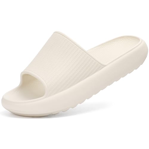 {"about_product": ["????? ???? ??????????:Made of extremely soft EVA, these sandals for women 2025 are supper squishy and lightweight, bring you a real cloud walking experience.", "???????? ????? ???????: 1.6\" thick sole and slightly arch support provide supreme shock absorption and unbeatable cushioning, help relieve tired feet and foot pains like Plantar Fasciitis, Swollen Feet.", "?????? ???????: These women's sandals slides are incredibly water-friendly, and buoyant. Unique design and versatility make them suitable for walking and other casual summer activities.", "???? ???? & ???????: Sturdy rubber outsoles with waved texture provide good traction and protection, even if they get wet, giving you a secure footing on the slick floor, great for the pool, shower, or beach.", "???? ????: Pillow slippers easily cleaned with water or a damp towel, and they are quick to dry. It is important to note that they will shrink when exposed to the sun, please avoid exposure to high temperatures for a long time."], "product_description": "Cloud slides feature a concise style and a solid design, suitable for all seasons and occasions such as the bathroom, indoor bedroom, living room, swimming pool, outdoor beach, holidays, spas, leisure activities, public showers, steam rooms, etc. This makes our sandals for women 2025 the ideal choice for various settings.The supportive nature of the EVA material can offer compression resistance. The deep heel cup, along with the cushioned and rebound thick sole, can provide ultra cushioning. When you take a bath, our shower slippers can also protect you from falling due to their strong non-slip ability. Moreover, the quick-drying and breathable properties can offer a more comfortable life experience.", "product_information": {"ASIN": "B0FVSP2Y9B", "Customer Reviews": "4.2 4.2 out of 5 stars \n\n (4,861)", "Product Warranty": "For warranty information about this product, please click here", "Best Sellers Rank": "#3,822 in Clothing, Shoes & Jewelry (See Top 100 in Clothing, Shoes & Jewelry) #8 in Women's Slide Sandals #9 in Men's Sandals", "Date First Available": "October 11, 2025"}, "product_details": {"Closure type": "Pull-On", "Sole material": "Warm Tips: Avoid exposure to the sun for a long time, in case EVA material shrank and deformed.", "Inner material": "Ethylene Vinyl Acetate (EVA)", "Outer material": "Ethylene Vinyl Acetate (EVA)"}}