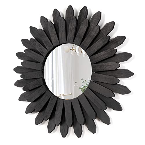 {"about_product": ["Handmade Shabby Chic Decorative Mirror: This country rustic mirror made of solid wood, torched finished features carbonized black color, and the beautiful wood texture makes it an antique accent. Two-layer wood pieces make it a stylish and eye-catching wall art on your wall", "Boho Wall Decor 12 In Mirror: The design of wood sunburst base on the element of boho style, it will be a nice boho wall art and goes well with your boho decor, farmhouse decor country rustic decor,modern deocr style; A perfect room decorations for your bedroom, living room, bathroom, kitchen, fireplace, entryway, home office, school, new partment, guest room of hotel", "No Distortion Mirror: This vintage mirror made of high quality high polish silver glass which can prevent distortion, which give you a real HD imaging. High quality coating for the ultimate durability and rust protection", "Easy to Hang at Anywhere You Want: Measure at 12 inch diameter with wood frame and diameter of 5.8 inch for mirror; Hang this stunning mirror in your bedroom above the bed, in your hallway or entryway, over your living room sofa.Comes with anchor and screw, quite easy to hang on the wall or lean on wall at desk, no any assembly", "Aesthetic Gift Idea: This shabby chic decorative piece could be a house warming gifts for new home or new apartment. your friends at birthday,Christmas,Thanksgiving Day or New Year gift"], "product_description": null, "product_information": {"ASIN": "B09BLB3BFM", "Size": "12 inch (1 pack)", "Brand": "Honiway", "Color": "Carbonized Black", "Shape": "Sunburst", "Style": "Bohemian,Farmhouse,Antique.Vintage.Rustic", "Theme": "Antique,Sunburst,Rustic", "Material": "Wood", "Room Type": "Bathroom, Bedroom, Kitchen, Living Room, entryway", "Is Hanging": "Yes", "Finish Type": "torched finish", "Frame Color": "Black", "Item Weight": "1 pounds", "Manufacturer": "Honiway", "Mounting Type": "Wall Mount", "Frame Material": "Wood", "Number of Items": "1", "Special Feature": "sunburst design", "Number of Pieces": "1", "Assembly Required": "No", "Best Sellers Rank": "#31,056 in Home & Kitchen (See Top 100 in Home & Kitchen) #28 in Wall-Mounted Mirrors", "Product Dimensions": "12\"L x 12\"W", "Date First Available": "October 14, 2021", "Specific Uses For Product": "Bathroom"}, "product_details": {"Brand": "Honiway", "Shape": "Sunburst", "Room Type": "Bathroom, Bedroom, Kitchen, Living Room, entryway", "Frame Material": "Wood", "Product Dimensions": "12"L x 12"W"}}