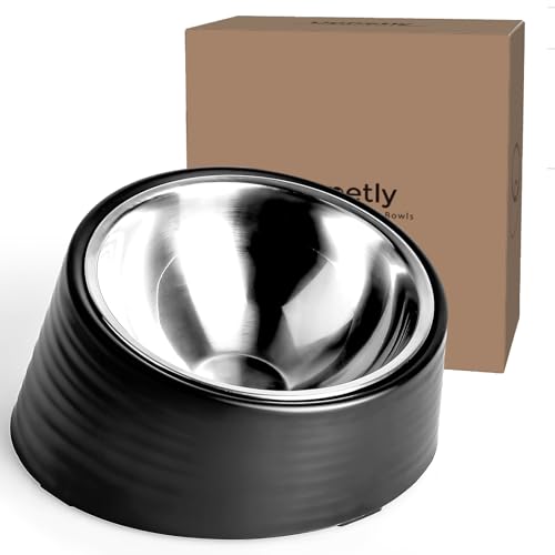 {"about_product": ["15° Slanted Dog Bowl Medium 1 Cup: the tilted dog food bowl keeps food falls to the center. Slightly inclined surface prevents food spilling. Easy for the flat face cats dogs to eat", "Premium Quality Bowls: the dog bowl is made from high quality food grade Stainless Steel. Durable, solid and harmless. Which is safe for your pets and use for many years", "Bowls Are Removable: you can remove the Stainless Steel bowl from the Melamine Stand. Easy for you to put in the food and clean it. They are all dishwasher safe", "Stable Heavy Stand: The Stand is heavy and bottom rubberized grips make stable. You pets is hard to turn over it. The inclined surface prevents food spilling", "Medium Dog Cat Raised Bwol: The medium dog bowl can hold about 1 cup/250ml dog cat food. It fit for medium cats,dog.This is perfect for any flat-faced dog. It will also help them from taking in too much air and getting choked"], "product_description": null, "product_information": {"ASIN": "B09CZ2MJX6", "Size": "M/1Cup", "Color": "Black-1Cup", "Style": "Modern", "Material": "Stainless Steel", "Brand Name": "Uppetly", "Item Weight": "0.64 Pounds", "Manufacturer": "Uppetly", "Care Instructions": "Dishwasher Safe, Hand Wash Only", "Included Components": "Instruction Manual, Stand", "Breed Recommendation": "Medium", "Date First Available": "August 18, 2021", "Age Range Description": "Adult", "Item Dimensions LxWxH": "5.5 x 5.5 x 2.75 inches", "Target Audience Keyword": "cats dogs, dogs", "Item Package Dimensions L x W x H": "7.36 x 7.2 x 4.09 inches"}, "product_details": {"Brand": "Uppetly", "Material": "Stainless Steel", "Target Species": "Cat, Dog", "Special Feature": "Nonslip, Spill Proof, Tilted", "Recommended Uses For Product": "Multiple Pets"}}