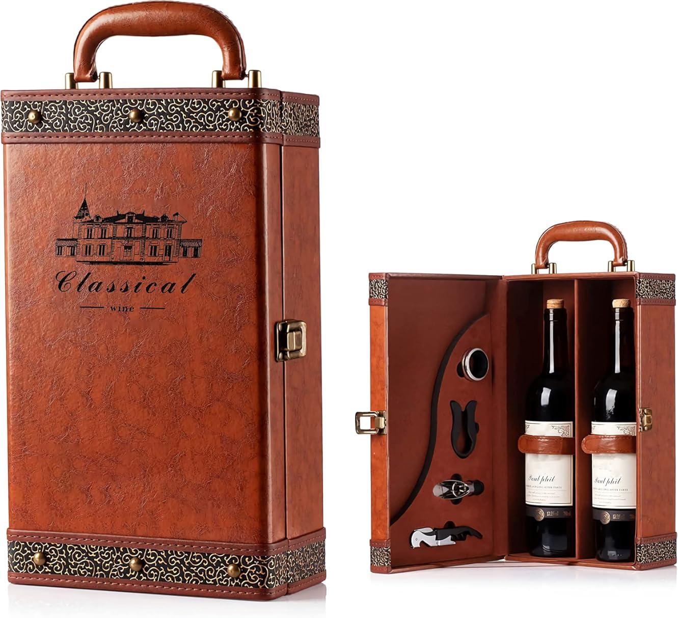 {"about_product": ["【Multipurpose wine box】Our wine storage box can hold up to 2 bottle of wine, craft beer or champagne. Suitable for Christmas,Valentine's Day,parties,anniversary,housewarming,picnics.And a perfect wine storage for carrying to dinner and BYOB restaurants.It also can be used for home bar decor,and your personal wine collection.", "【Upgrade Your Wine Bottle】This 2 bottle portable wine gift box can upgrade the class of your wine bottle,making the bottle looks upscale.Best gift for wine lovers", "【High Quality Artificial Leatherl】This 2 bottle wine gift case is Covered with high quality Artificial leather material,which is smooth and sturdy,and looks fashionable, elegant and luxurious", "【Sturdy and Strable】This wine bottle carrier tote is processed carefully and precisely withstrict quality control,more sturdy and strable than oxford canvas fabric wine bags.With handle support and two safety belts inside, keep the safety of your wine bottles during transport", "【High Quality Tools】This Christmas wine gift case is equipped with 4 wine accessories,including 1 corkscrew, 1 foil cutter, 1 pourer and 1 stop drip ring.(Wine bottles and wines are not included)"], "product_description": "Introducing the lxllnqh 2 Bottle Wine Gift Box, a versatile and elegant solution for wine storage and transportation. This box, made of high-quality artificial leather, can hold up to 2 standard bottles of wine, champagne, or craft beer, making it perfect for parties, anniversaries, housewarming gifts, and picnics. The interior is equipped with 4 premium wine accessories, including a corkscrew, foil cutter, pourer, and stop drip ring, providing a complete set for any wine enthusiast. The sturdy construction, handle support, and two safety belts ensure the safe transport of your bottles, while the modern style and solid color make it a stylish addition to any home bar decor or wine collection. With dimensions of 7.9 x 4.7 x 13.6 inches, this wine carrier tote is compact yet spacious, and the zipper closure ensures easy access and secure closure. Experience the luxury and convenience of the lxllnqh wine gift box today.", "product_information": {"ASIN": "B09JT1W9W2", "Item Weight": "2.66 pounds", "Best Sellers Rank": "#11,584 in Kitchen & Dining (See Top 100 in Kitchen & Dining) #19 in Wine Accessory Sets", "Product Dimensions": "7.9 x 4.7 x 13.6 inches", "Date First Available": "October 19, 2021"}, "product_details": {}}