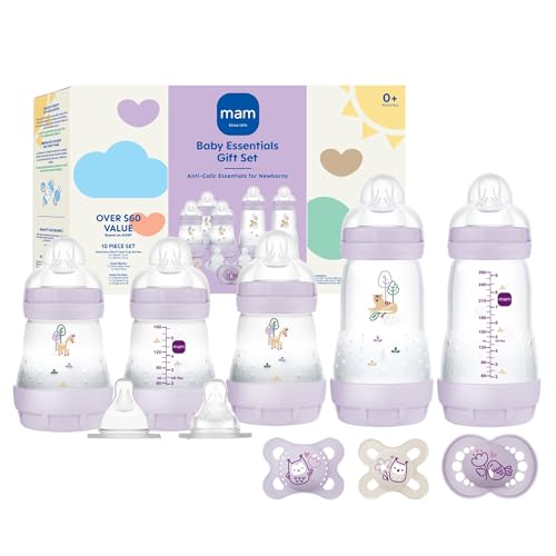 {"about_product": ["START OFF RIGHT: Everything your newborn needs in the first months of life, anti colic bottles 5oz for babies 0+ months and 9oz for 2+ months and Start newborn pacifiers for 0-16 month old babies.", "BABY BOTTLES FOR COLIC, GAS AND REFLUX: Anti colic venting system reduces colic symptoms in 80%* of babies, eliminating bubbles that cause gas and aggravate colic and reflux symptoms in babies.", "94% BABY ACCEPTANCE RATE**: SkinSoft nipple mimics breastfeeding for newborn babies, while making the transition between breastfeeding to bottle feeding a breeze for 0-6 months babies.", "EASY TO CLEAN: Our baby bottles have specially designed wide openings on top and bottom for easy, total cleaning and maximum airflow for drying, can self-sterilize in the microwave in 3 minutes.", "IDEAL GIFT SET: A perfect baby registry gift with all the essentials for newborn babies to older babies, containing the best pacifier for breastfed babies and anti colic bottles in 5 oz and 9 oz."], "product_description": "The MAM Newborn Essentials \"Baby Essentials\" Matte Gift Set has everything new parents and growing babies need. This 10 piece set includes THREE 5 oz anti-colic bottles with slow flow nipples, TWO 9 oz anti-colic bottles with medium flow nipples, ONE extra slow flow bottle nipple, ONE fast flow bottle nipple, ONE Start Newborn pacifier, ONE 0-6 month pacifier, and ONE 6+ month pacifier. The pacifiers, specially designed in 3 different sizes to grow with your baby, have an orthodontic SkinSoft nipple that feels natural and supports jaw development. Whether you’re using baby formula or expressed breast milk, our Easy Start Self-Sterilizing Anti-Colic Bottle is the perfect fit for newborns. The innovative vented base allows for an even drinking flow, helping to reduce colic for 80%* of babies. Each MAM Anti-Colic Bottle is self-sterilizing. Simply add water and pop in the microwave for three minutes. The bottle is made from BPS and BPA free materials and the removable bottom makes clean-up a snap. Perfect for your registry or baby shower! Dishwasher safe. *Field study, Austria 2011, tested with 73 mothers of colicky babies / Market research, USA 2010, tested with 35 mothers of colicky babies.", "product_information": {"ASIN": "B09JVX7X8Y", "Style": "Set", "Bottle type": "Anti-Colic Bottle", "Item Weight": "5 ounces", "Material free": "BPA Free", "Dishwasher safe": "Yes", "Number Of Items": "10", "Best Sellers Rank": "#3,206 in Baby (See Top 100 in Baby) #25 in Newborn Gift Sets", "Item model number": "9631-006-0-1", "Batteries required": "No", "Bottle nipple type": "Orthodontic", "Product Dimensions": "2.95 x 11.54 x 7.09 inches", "Material Composition": "Silicone"}, "product_details": {"Brand": "MAM", "Color": "Cotton", "Item Weight": "5 Ounces", "Bottle Nipple Type": "Orthodontic", "Material Type Free": "BPA Free"}}