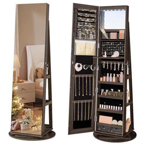 {"about_product": ["[Frameless Mirror, Prettier] This mirror jewelry cabinet comes with a 14.6\" x 61\" frameless, full-length mirror that’s easy on the eyes and gives you a head-to-toe reflection, making your daily outfit checks more enjoyable", "[Massive Storage, Ends the Mess] 120 earring slots, 54 stud earring holes, 18 necklace hooks, 91 ring slots, 3 bracelet rods—the jewelry jungle ends here. Plus, there are 3 compartments, 2 drawers, 4 shelves, and a bag for your makeup!", "[Lights On, Brighter Inside] 6 LED lights illuminate your jewelry when you open the door of this jewelry organizer, allowing you to pick out the right accessories easily without waking your beloved one with ceiling lights", "[Primping Up Made Easier] A built-in mirror and a flip-over shelf as a counter for your makeup create a mini “vanity table”, allowing you to apply makeup and accessorize your look without closing the cabinet door", "[Made to Last] The large 21.5\" dia. round base and quality MDF of this jewelry armoire ensure stability while its velvet lining protects your jewelry from scratches—your bling will remain intact for years to come"], "product_description": null, "product_information": {"UPC": "194343118239", "ASIN": "B09JW38JRR", "Size": "21.5\"D x 21.5\"W x 63.8\"H", "Brand": "SONGMICS", "Color": "White + Black", "Shape": "Rectangular", "Style": "Modern", "Finish": "MDF (Medium Density Fiberboard), Steel, Velvet, Glass", "Material": "MDF (Medium Density Fiberboard), Steel, Velvet, Glass", "Finish Type": "MDF (Medium Density Fiberboard), Steel, Velvet, Glass", "Item Weight": "50.2 pounds", "Part Number": "UJJC007W01", "Manufacturer": "SONGMICS", "Mounting Type": "Freestanding", "Warranty Type": "No Warranty", "Inner Material": "Velvet", "Number of Items": "1", "Special Feature": "Frameless Mirror, Massive Storage", "Target Audience": "Girls, Women", "Number Of Pieces": "1", "Special Features": "Frameless Mirror, Massive Storage", "Best Sellers Rank": "#10,833 in Clothing, Shoes & Jewelry (See Top 100 in Clothing, Shoes & Jewelry) #3 in Jewelry Armoires", "Item model number": "UJJC007W01", "Number of Drawers": "2", "Product Dimensions": "21.5\"D x 21.5\"W x 63.8\"H", "Batteries Included?": "No", "Batteries Required?": "Yes", "Included Components": "1 x Jewelry Cabinet, 2 x Key, 1 x Accessory Kit, 1 x Instructions", "Date First Available": "March 8, 2022", "Jewelry Storage Type": "Jewelry Armoire", "Item Package Quantity": "1", "Number of Compartments": "10", "Recommended Uses For Product": "Necklace, Bracelet, Ring, Earring, Bangle", "Global Trade Identification Number": "00194343118239"}, "product_details": {"Brand": "SONGMICS", "Color": "White + Black", "Shape": "Rectangular", "Style": "Modern", "Material": "MDF (Medium Density Fiberboard), Steel, Velvet, Glass", "Finish Type": "MDF (Medium Density Fiberboard), Steel, Velvet, Glass", "Special Feature": "Frameless Mirror, Massive Storage", "Target Audience": "Girls, Women", "Product Dimensions": "21.5"D x 21.5"W x 63.8"H", "Recommended Uses For Product": "Necklace, Bracelet, Ring, Earring, Bangle"}}
