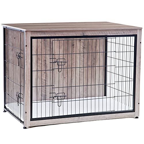 {"about_product": ["【Multi-functional】 This pet furniture can be used as pet crate ,also as a side table, end table or night stand.The wide top provides enough place to put some decorations such as small/medium plant, magazines, family picture frames and night lamps and so on.", "【Double doors design & Adjustable feet】 Your pet will go in and out easily with double doors. When the floor is not flat , this side table can be kept stable by the adjustable feet.", "【Particleboard and wire construction】 Chew-resistant construction for pet-safe durability and long service life.", "【Dog crate with Cushion】 Matching cushion in the crate take your dog a warm and more comfortable sleep, and also we use the wooden plate at the bottom, no pet foot jamming, more safety.", "【Size selection】 please be sure to measure your pet's height and length data before you buy, refer to the purchase advice to choose the right crate; if you find it difficult to choose, you can leave your pet's breed, height and length in the Q&A area, we will immediately recommend the right crate for you!"], "product_description": null, "product_information": {"ASIN": "B09LMGGG7W", "Size": "27.2\"L x 20.1\"W x 23.6\"H", "Color": "Dark Gray", "Material": "Wood", "Brand Name": "Dwanton", "Item Weight": "29.8 pounds", "Manufacturer": "DWANTON", "Number of Items": "1", "Included Components": "Stand", "Breed Recommendation": "Medium,Small", "Date First Available": "March 28, 2022", "Item Dimensions LxWxH": "27.2 x 20.1 x 23.6 inches", "Target Audience Keyword": "dogs", "Specific Uses for Product": "Indoor", "Item Package Dimensions L x W x H": "29.5 x 24.8 x 5 inches"}, "product_details": {"Brand": "Dwanton", "Material": "Wood", "Special Feature": "Adjustable, Comfortable, Durable, Secure, Warm", "Product Dimensions": "27.2"L x 20.1"W x 23.6"H", "Specific Uses For Product": "Indoor"}}