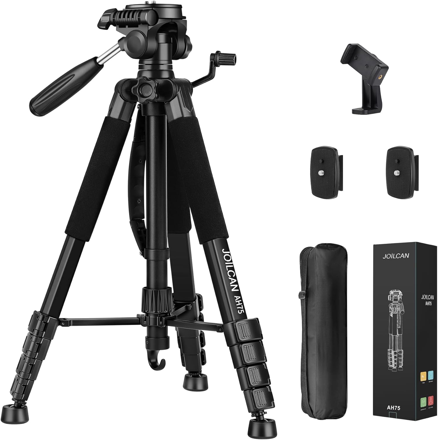 {"about_product": ["【Lightweight & Easy to Adjust】Upgraded trapezoidal flap lock tripod adjusted from 19.5\" and 74\" to meet different height needs for variety shooting environments and photography. 18\" compact size and 3.15 lbs weight make tripod easy to carry with travel bag", "【Durable & Horizontally Stable】Professional tripod for camera and phones provides ultra stability and steadiness for various terrain. Rubber feet provide a firm grip strong friction. Thicker tube makes the tripod more torsional resistant & anti-shaking", "【Tripod for Camera and Phones】Quick-release plates and phone hodler maximize the compatibility to the greatest extent. Standard 1/4\" screw compatible with all cameras, DSLR, SLR, webcams, projector, ring light, spotting scopes, lasers, binoculars, etc", "【 3-Way Pan Head 360° Rotation】 JOILCAN camera tripod with stable smooth ergonomic 3-way pan head: headlock, pan lock, tilt lock, satisfy all the needs of vertical, horizontal, and overhead photography, et. Camera tripod stand with zippered storage bag", "【 Widely Application】 Heavy duty camera tripod is suitable for photo and recording, selfies, parties, traveling, hiking, sports, Vlog, meetings, live streaming, etc. 3-position leg angle adjustment tripod for different scenarios and photography conditions"], "product_description": null, "product_information": {"ASIN": "B09NVBW6T5", "Item Weight": "2.6 pounds", "Manufacturer": "JOILCAN", "Best Sellers Rank": "#7 in Complete Tripod Units", "Item model number": "AH75", "Product Dimensions": "5.16 x 4.84 x 17.48 inches", "Date First Available": "April 23, 2022"}, "product_details": {"Brand": "JOILCAN", "Color": "Black", "Material": "Aluminum", "Model Name": "Tripod", "Item Weight": "2.6 Pounds", "Weight Limit": "15 Pounds", "Maximum Height": "74 Inches", "Special Feature": "camera tripod, tripod for camera, tripod for dsl, tripod for iphone", "Tripod Head Type": "Pan Heads", "Compatible Devices": "Camera, Phone, Projector, Spotting Scopes"}}