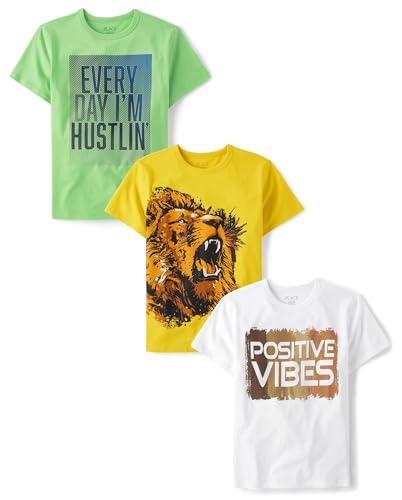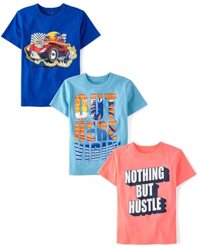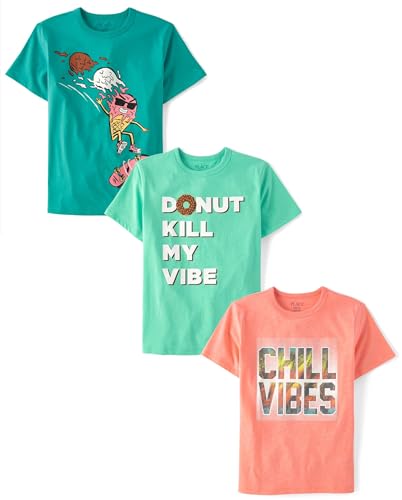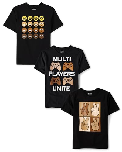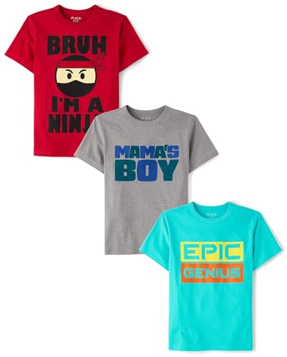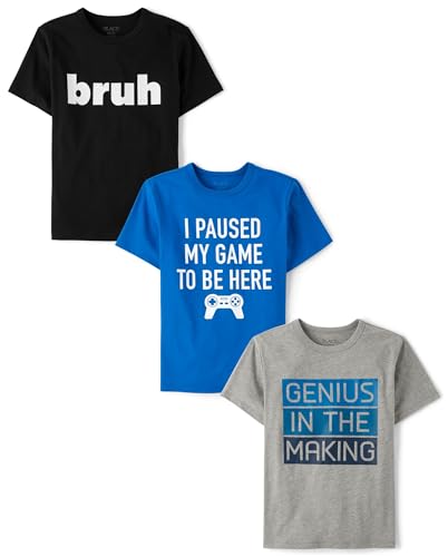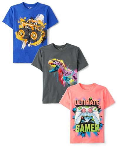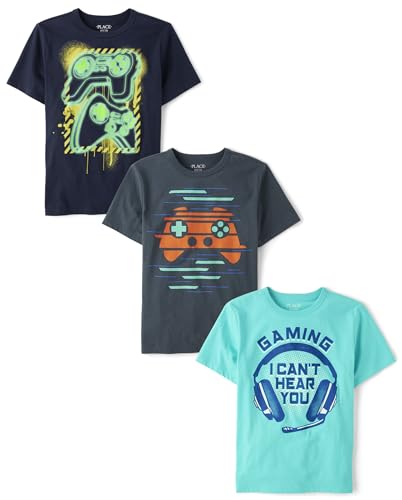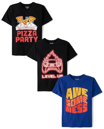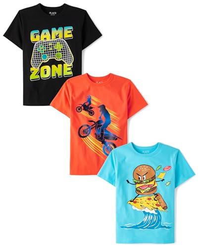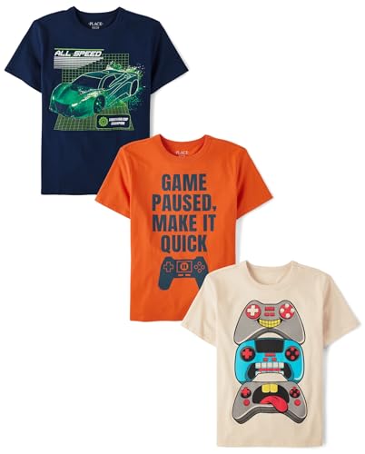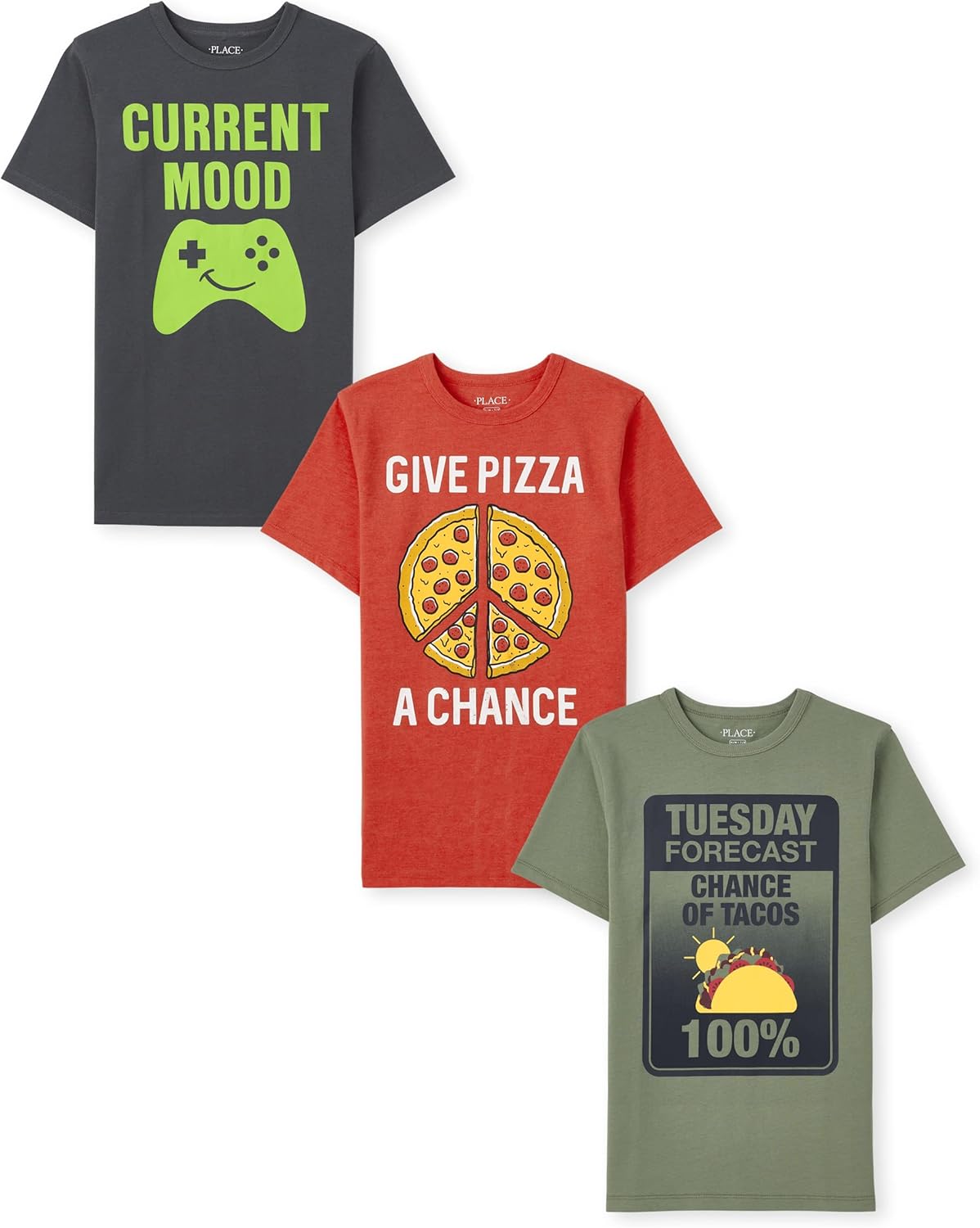 {"about_product": ["GRAPHIC T-SHIRT — A classic, comfortable fit with graphics he'll love", "FABRIC — Gray Steel and Olive Press style made of 100% cotton jersey; Rocket style made of 60% cotton/40% polyester jersey", "DESIGN — Features a rib-knit crew neck and short sleeves", "MULTIPACK — 3-pack of graphic t-shirts: 1 style with 'Tuesday Forecast Chance Of Tacos 100%' and taco graphic design at front; 1 style with 'Give Pizza A Chance' and pizza peace sign graphic design at front; 1 style with 'Current Mood' and smiling video game controller", "THE CHILDREN'S PLACE — We offer a huge selection of kid's clothing! Shop us for jeans, shorts, leggings, chinos, polo shirts, dresses, pajamas, and accessories."], "product_description": "The Children’s Place offers a huge selection of kid's clothing! Shop us for jeans, shorts, leggings, chinos, polo shirts, dresses, uniforms, pajamas, and accessories. Made with premium quality materials at a great value. Kids clothing made simple.", "product_information": {"ASIN": "B0CHZ6HD11", "Department": "boys", "Manufacturer": "The Children's Place", "Customer Reviews": "4.8 4.8 out of 5 stars \n\n (2,281)", "Best Sellers Rank": "#3,267 in Clothing, Shoes & Jewelry (See Top 100 in Clothing, Shoes & Jewelry) #7 in Boys' T-Shirts", "Date First Available": "September 13, 2023"}, "product_details": {"Origin": "Imported", "Fabric type": "60% Cotton, 40% Polyester", "Closure type": "Pull On", "Care instructions": "Machine Wash"}}