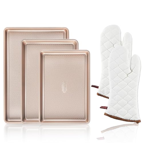 {"about_product": ["INGENUITY DIAMOND TEXTURE - The cookie sheet pan set has a diamond texture on the base increases its non-stick properties and ensures even and quick heat airflow to the cookie, which makes the cookies consistently baked without any over or undercooked parts.", "PREMIUM EXTRA-THICK MATERIAL - With 57% thicker carbon steel, these durable oven trays are constructed from heavy-gauge carbon steel for stability, even heat distribution, and durability for years to come. Warranty against peeling off with heat-resistance temperature: 450℉.", "ALL EXCLUSIVE SET - This baking pan set includes 3 nonstick cookie sheets (13''x9'' /15''x10'' /17.5''x12''). They are just the right size, small for baking cookies, pastry, and lasagna, medium size for baking jelly rolls, large size for baking chicken and vegetables, etc. Just one set can easily satisfy your daily baking needs and help you take your baking to the next level.", "A HEALTHIER BAKING CHOICE - The Whitford-reinforced for exceptional release, the two-layer coating is chemical-free – PFOA, BPA and PTFE. It is thus safe to use. In addition, it has a smooth, non-stick surface thanks to a 34% silicon content that makes it a breeze to clean while protecting against scratching, staining, and corrosion.", "EXQUISITE TABLE ART - The fact that a baking pan set is not only a practical baking tool but also an affordable table art. Great kitchen utensils should be made with quality and aesthetics in mind. Our unique champagne gold baking dish is the perfect combination of them, adding elegant aesthetics to your dining table.", "100% SATISFACTION GUARANTEE – We are sure that our nonstick cookie sheet pan will win your heart with its unique design, stylish colors, and versatility! If you have a fair concern, please contact us, we will provide 365 days of service and reply within 24 hours."], "product_description": null, "product_information": {"ASIN": "B09QPQVK37", "Size": "Half/Jelly Roll/Quarter", "Brand": "HONGBAKE", "Color": "Champagne Gold", "Language": "English", "Material": "Carbon Steel", "Item Weight": "4.23 pounds", "Manufacturer": "HONGBAKE", "Best Sellers Rank": "#778 in Kitchen & Dining (See Top 100 in Kitchen & Dining) #5 in Baking & Cookie Sheets", "Is Dishwasher Safe": "Yes", "Material Type Free": "PFOA Free, PTFE Aluminum Lead Cadmium PFOS PFAS Chemical BPA Free", "Product Dimensions": "17.5\"L x 12\"W x 1\"H", "Date First Available": "February 19, 2022"}, "product_details": {"Size": "Half/Jelly Roll/Quarter", "Brand": "HONGBAKE", "Color": "Champagne Gold", "Material": "Carbon Steel", "Item Weight": "4.2 Pounds", "Is Dishwasher Safe": "Yes", "Material Type Free": "PFOA Free, PTFE Aluminum Lead Cadmium PFOS PFAS Chemical BPA Free", "Product Dimensions": "17.5"L x 12"W x 1"H"}}